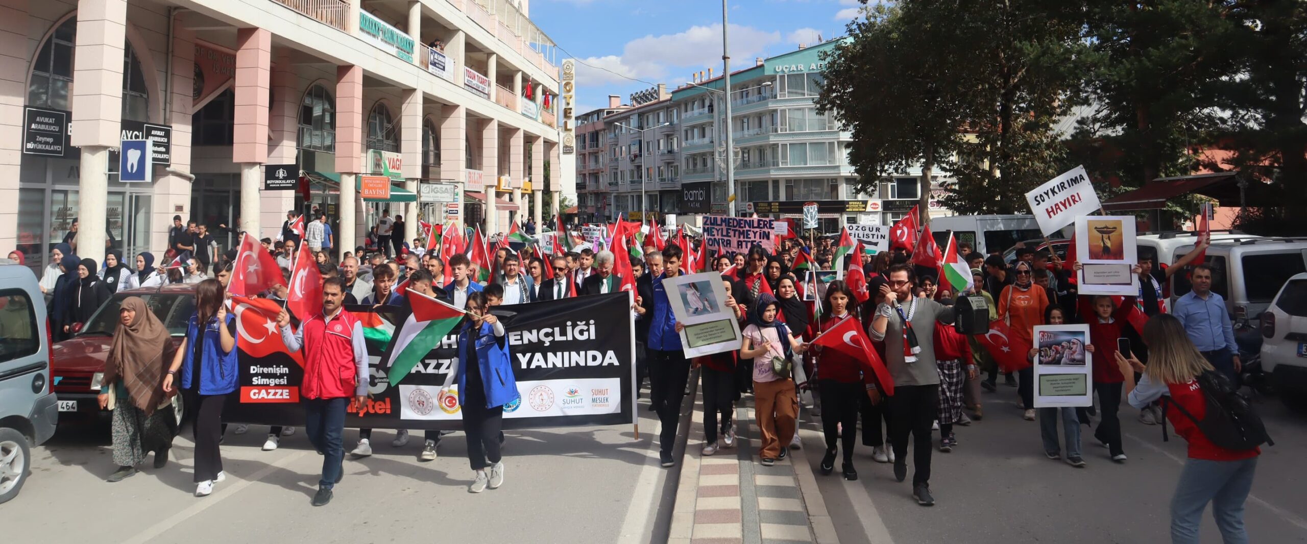 Gazze’de 365 gündür süren direnişe destek olmak için Şuhut Kaymakamlığı koordinesinde, İlçe Milli Eğitim Müdürlüğü, Şuhut Müftülüğü, KYK yurtları, üniversiteler, STK ve Şuhutlu vatandaşların destekleriyle Şuhut Gençlik Merkezi Müdürlüğü tarafından düzenlenen “Direnişin Simgesi Gazze” yürüyüşü ilçede gerçekleştirildi.