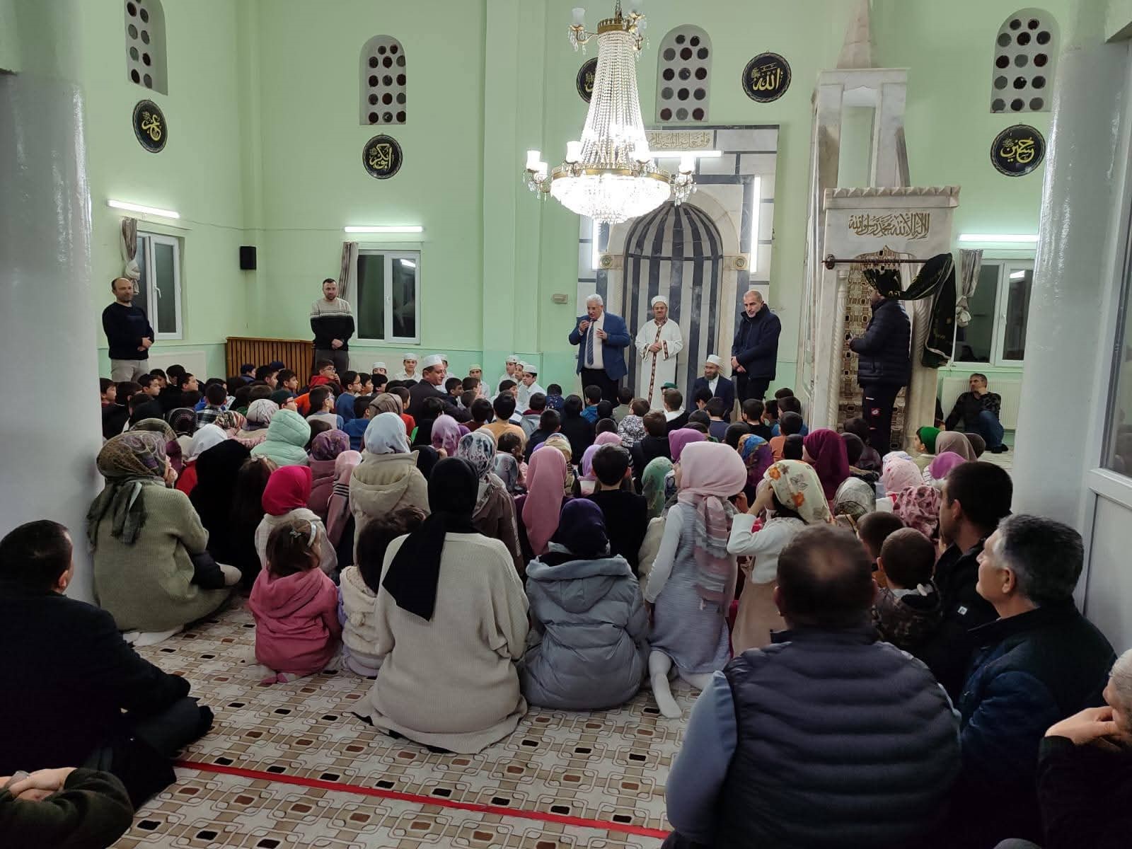 Kurtuluş İlkokulu ile ortaklaşa düzenlenen programda, Kur’an Kursu Camii çocukların neşesi ve coşkusuyla adeta bir çiçek bahçesine dönüştü. Öğrenciler, öğretmenler ve velilerin yoğun katılım gösterdiği program, yatsı namazının hep birlikte eda edilmesiyle başladı.