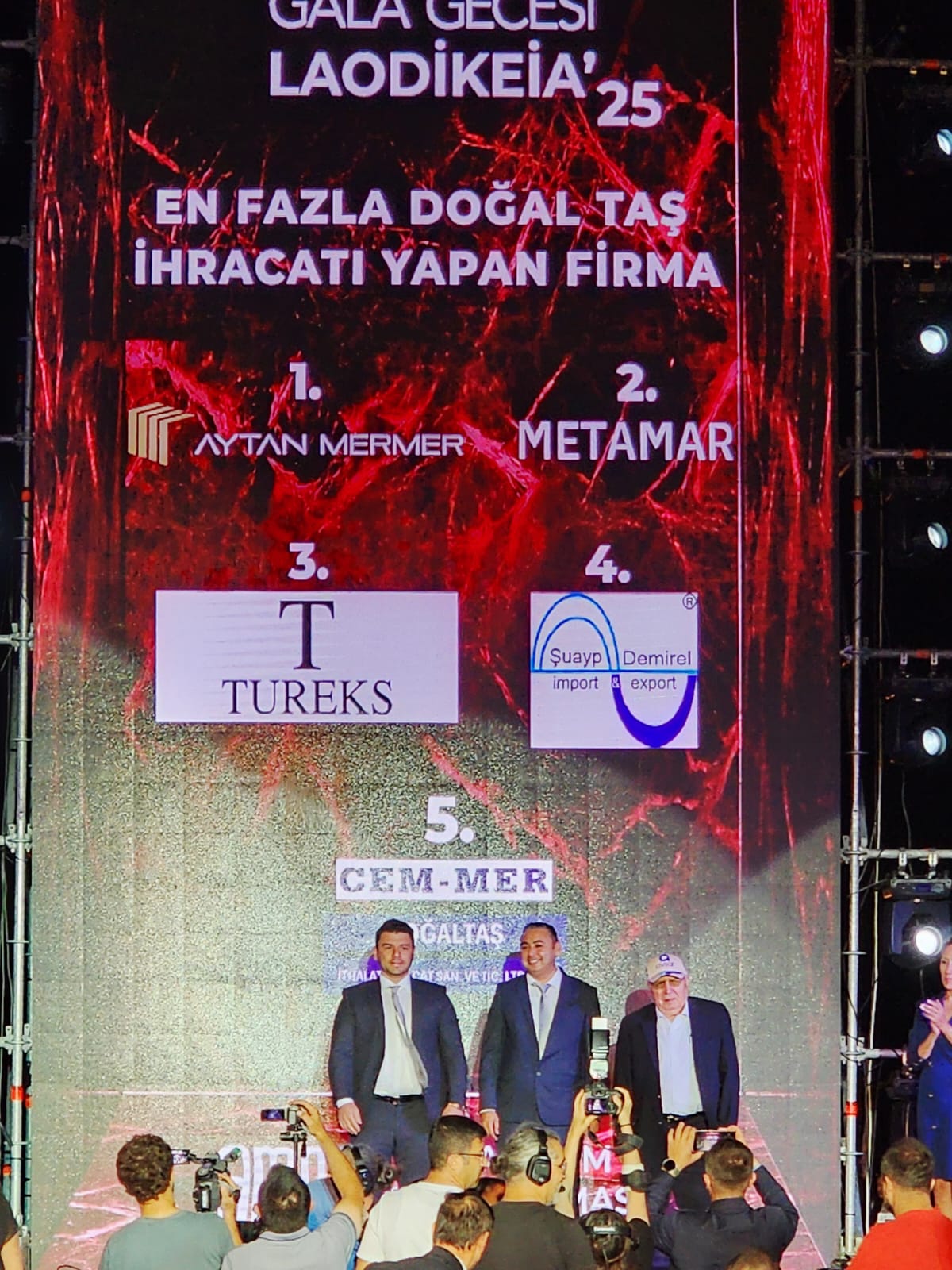 Gecede ödülü alan Marble Systems Tureks Genel Müdürü İsmail Aydemir, bu ödülün sadece Marble Systems Tureks’in değil, Türk doğal taş sektörünün global pazardaki konumunun da bir yansıması olduğunu ifade ederken sözlerini şöyle sürdürdü: “Tureks, 43 yıldır tasarım, kalite, teknoloji ve sürdürülebilir üretim anlayışıyla Türk doğal taş ve mermerini 5 kıtada 50’den fazla ülkeye gururla taşıyor. Doğal taşı sadece çıkaran ve işleyen değil, ona hayat veren, ona hikâye katan bir vizyon ile çalışıyoruz. Başta üretimden ihracata, tasarımdan lojistiğe kadar katkı sunan tüm ekip arkadaşlarımıza, iş ortaklarımıza ve bize güvenen müşterilerimize sonsuz teşekkür ediyoruz. Türkiye’nin doğal zenginliğini katma değere dönüştürmeye ve dünya pazarlarındaki konumumuzu daha da güçlendirmeye devam edeceğiz” dedi.