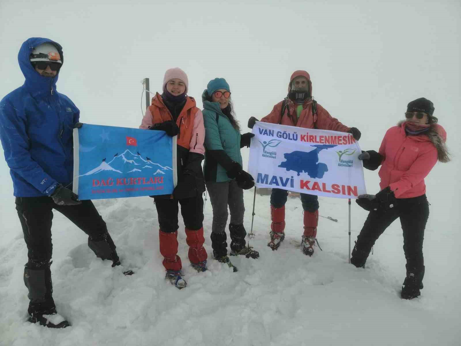 Kınıközü köyünde bir araya gelen dağcılar, karla kaplı 3 bin 50 rakımlı Berit Dağı’na tırmanış yaptı. Zirveye ulaşan dağcılar, fotoğraf çektikten sonra ‘Van Gölü kirlemesin, mavi kalsın’ pankartını açtı.