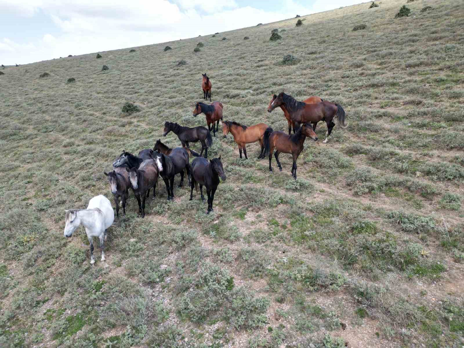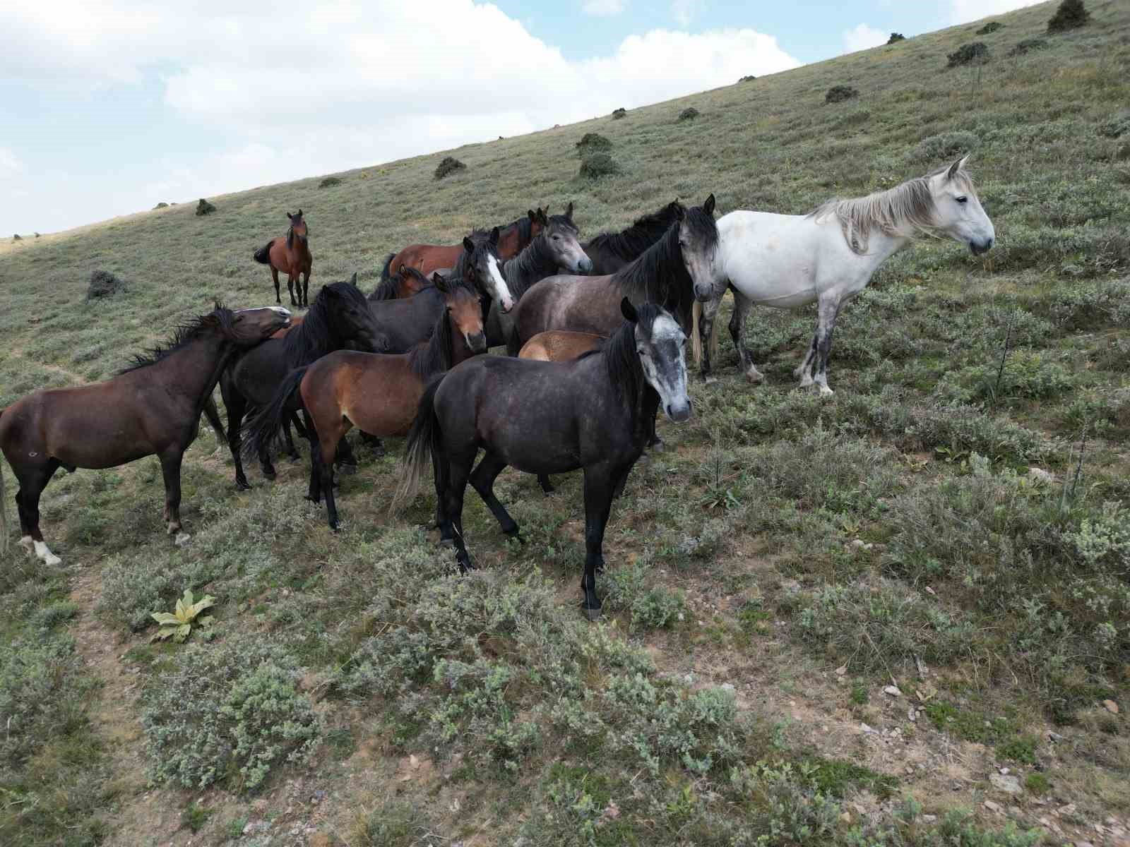 Ürkeklikleri ile bilinen yılkı atları sıcak yaz günlerinde yiyecek aramak için indikleri Afyonkarahisar’daki yaylalarda dron ile görüntülendi.