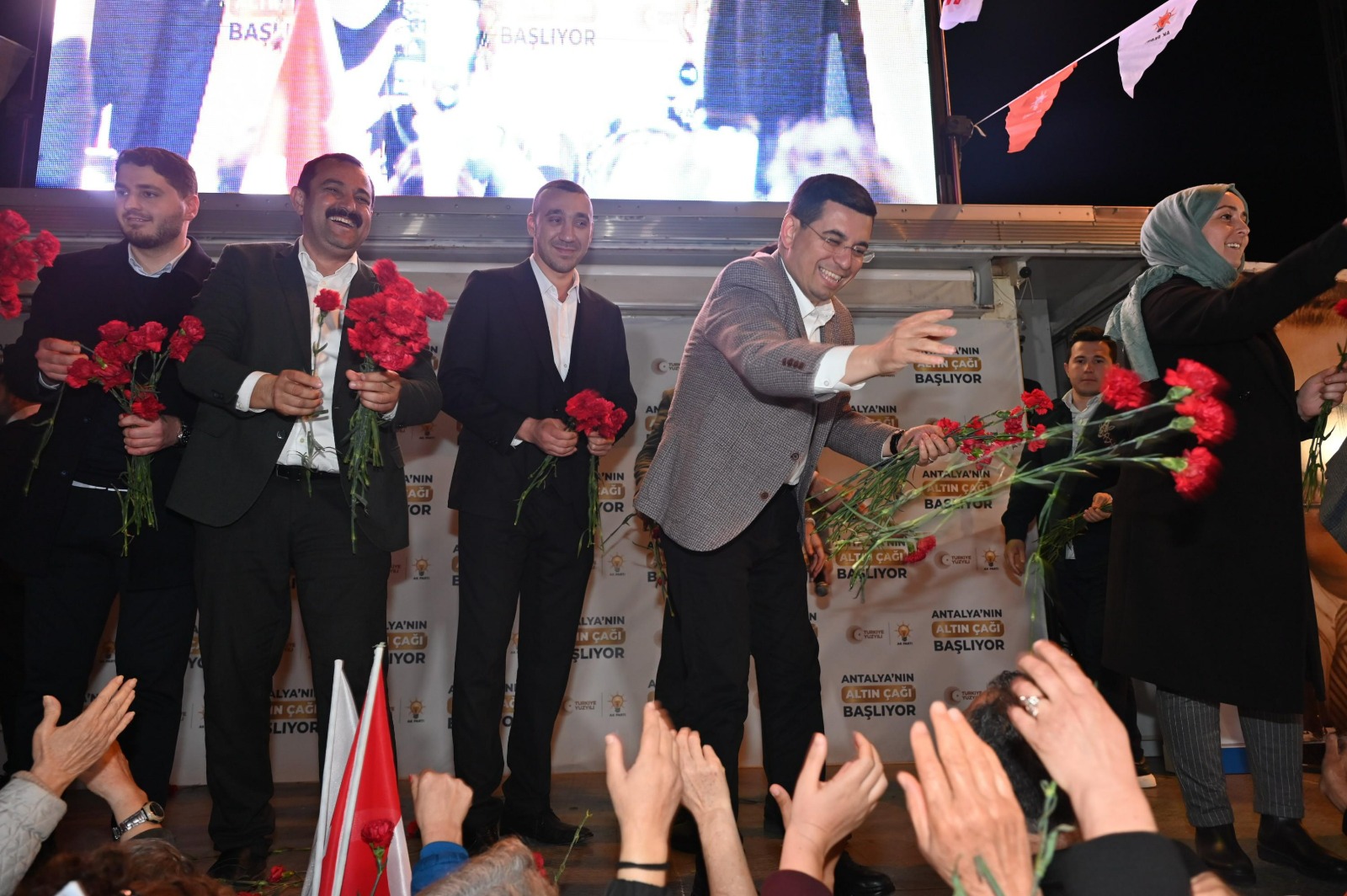 Konuşmaların ardından AK Parti Antalya Milletvekili Mustafa Köse, Cumhur İttifakı’nın Antalya Büyükşehir Belediye Başkan adayı Hakan Tütüncü ve Kepez Belediye Başkan adayı Rıza Sümer vatandaşlara kırmızı karanfil attı.