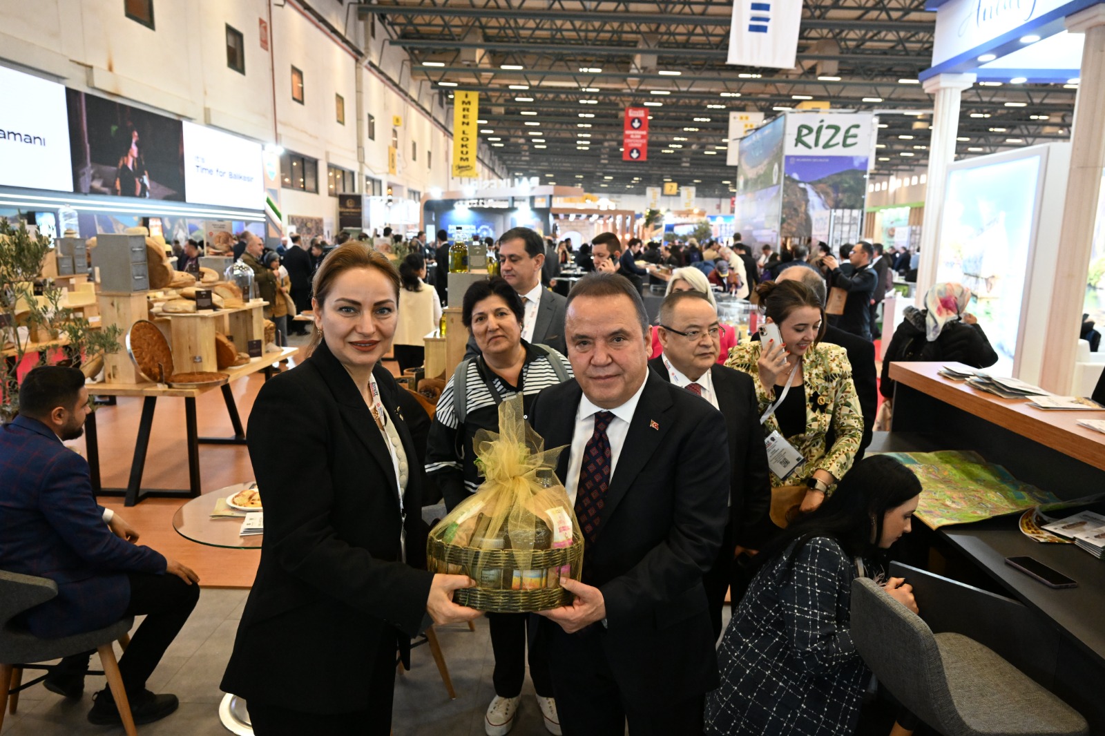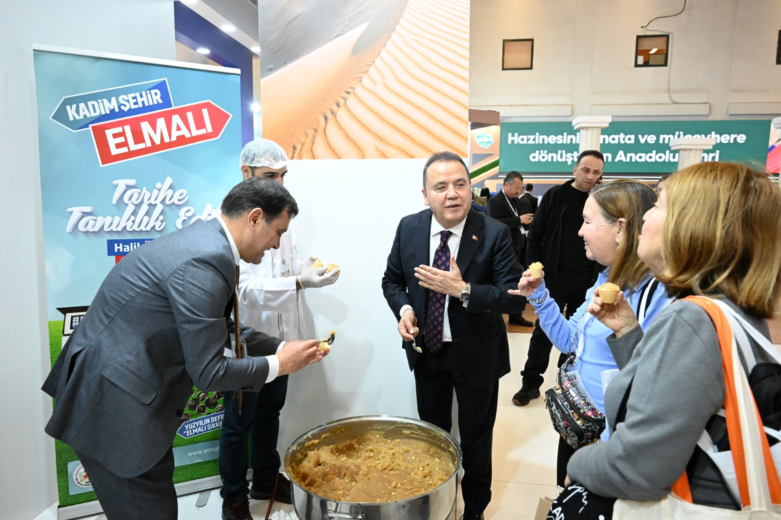 Antalya, fuarda Büyükşehir Belediyesi öncülüğünde oluşturulan ANTAB çatısı altında yer alıyor. Antalya’nın ilçeleri fuarda farklı özellikleriyle yer alarak kentin tanıtımına katkı sağlanıyor. Başkan Muhittin Böcek, EMITT Fuarı’nda Antalya ve ilçe stantlarında misafirlerini ağırlayarak Elmalı’ya özgü helva ikramında bulundu.