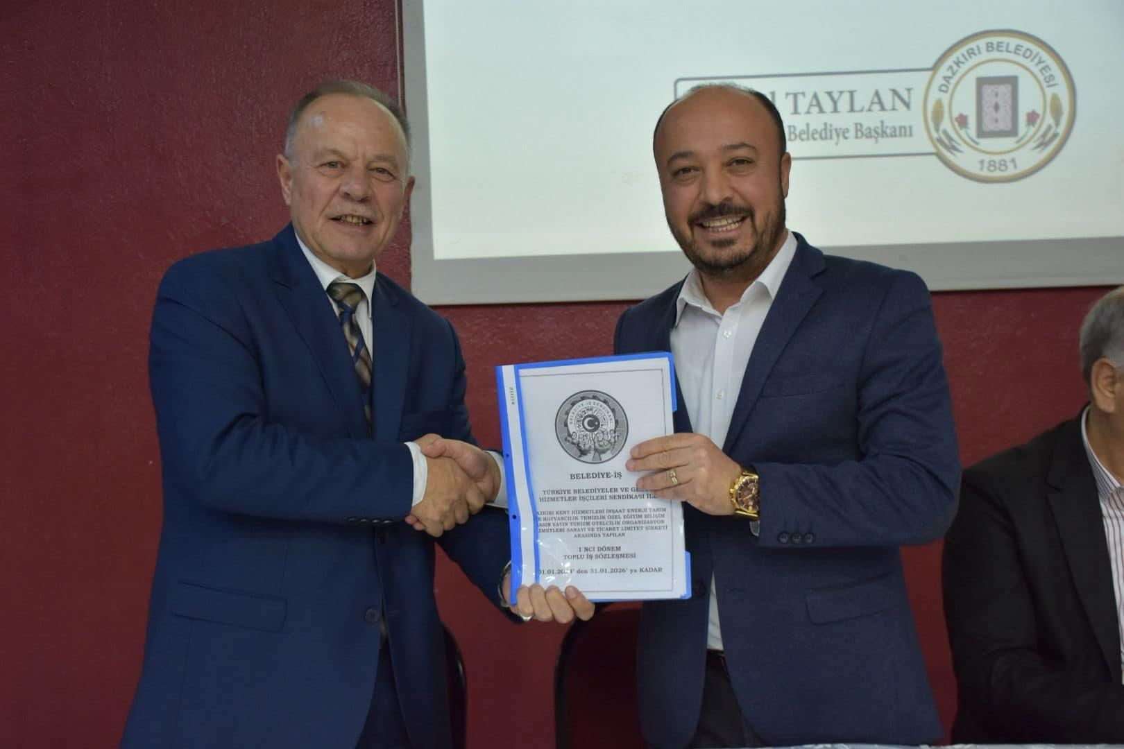 Dazkırı Belediyesi çalışan işçiler için toplu sendika sözleşmesi imzalandı. İmzalanan sözleşme ile belediyedeki tüm işçiler sendikal haklarına sahip oldu. Dazkırı Belediye Başkanı İsmail Taylan, “İlçemizin gururu, 135 kişilik muhteşem ekibimizle birlikte daha da büyüyoruz. Emekçilerimize daha iyi koşullar sağlamak için Belediye İş Sendikası ile imzaladığımız iş sözleşmesi ile en düşük maaşı 23 bin TL’ye yükselterek emekçilerimizin haklarını güçlendirdik. Hep birlikte, daha yaşanabilir bir Dazkırı için çalışmaya devam edeceğiz. İlçemizin her bir köşesine sevgi ve hizmetle dolu günlere devam edeceğiz” dedi./Şahan Kartal