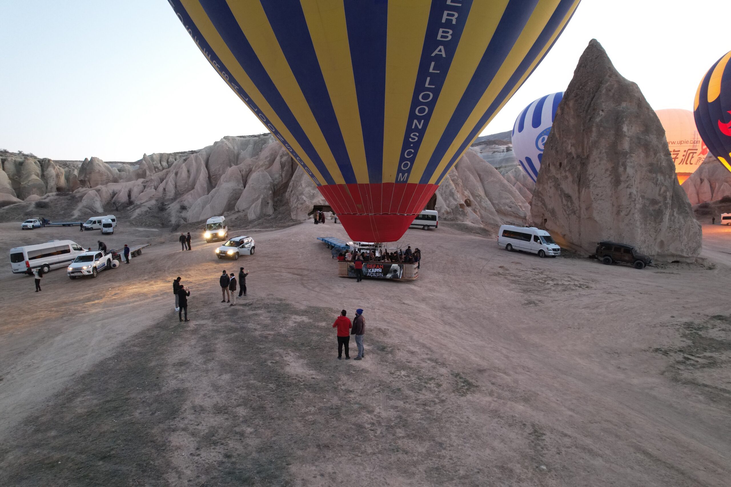 Sabahın erken saatlerinde Göreme beldesinden havalanan sıcak hava balonları sepetlerine astıkları Türkçe ve İngilizce ‘Gazze’de ateşkes’, ‘Savaşa Hayır’, ‘Refah Sınır Kapısı Açılsın’ yazılı pankartlar ile gökyüzüne yükseldi. Nevşehir Filistin Destek Platformu tarafından organize edilen etkinlikte konuşan Platform Başkanı Mustafa Gençtürk yaptığı açıklamada, “7 Ekim’den bu yana 4 buçuk aydır, dünya eşi görülmemiş katliamı seyrediyor. Yaklaşık 29 bin kardeşimiz şehit, 69 bin kardeşimiz yaralı ve binlercesi enkaz altında. Birleşmiş Milletler’in tespitine göre bölgede gıda krizi had safhaya ulaşmış durumda. Bölgeye çok az şekilde gıda girebilmekte. İşgalciler güvenli bölge diye sürdükleri bölgelerde de bombalamaktadırlar. Çocukların ve kadınların sığındığı, okullar, camiler ve kamplar bombalanmakta. Biran önce ateşkesin sağlanmasını ve refah sınır kapısının açılmasın istiyoruz. Bu gün Kapadokya’da balonlar Gazze için ateşkes ve Refah Kapısı’nın açılması için havalanıyor” dedi.
