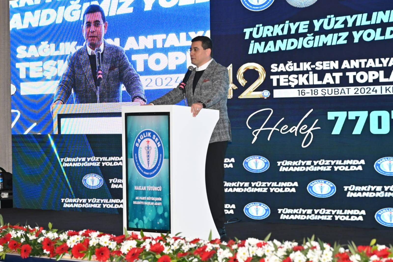 Antalya’nın dört bir yanında seçim çalışmalarını sürdüren Cumhur İttifakı’nın Antalya Büyükşehir Belediye Başkan adayı Hakan Tütüncü, SAĞLIK-SEN’in 42. Antalya Teşkilat Toplantısına katıldı. Davet üzerine toplantıya katılan Tütüncü, sağlık çalışanlarının yoğun ilgisi ile karşılandı. AK Parti Antalya Milletvekilleri Atay Uslu ve İbrahim Ethem Taş’ın da bulunduğu toplantıda konuşan Tütüncü, “İnsanların en hayırlısı insana en çok faydası dokunandır. Ben bu salona baktığım zaman Allah katında en güzel mevkileri elde etmiş, en güzel en hayırlı işler yapan hanımefendileri ve beyefendileri görüyorum” dedi.