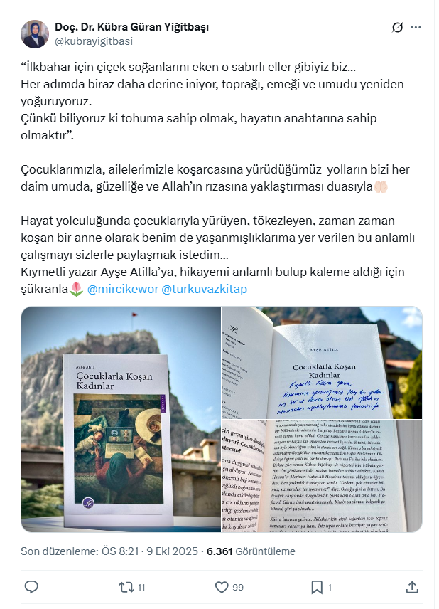 Afyonkarahisar Valisi Doç. Dr. Kübra Güran Yiğitbaşı, sosyal medya hesabından yaptığı paylaşımda, kendi hikayesine ”Çocuklarla Koşan Kadınlar” kitabında yer veren yazar Ayşe Atila’ya teşekkür ederek, ”İlkbahar için çiçek soğanlarını eken o sabırlı eller gibiyiz biz… Her adımda biraz daha derine iniyor, toprağı, emeği ve umudu yeniden yoğuruyoruz” dedi…