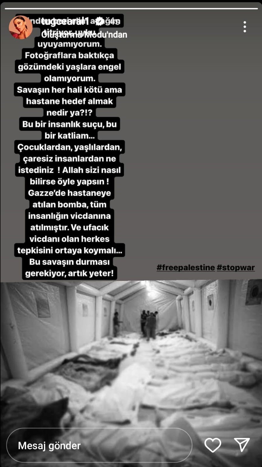 İsrail ablukası altındaki Gazze’de bulunan El-Ehli Baptist Hastanesinin bombalanmasına ünlü manken ve oyuncu Tuğçe Aral sosyal medya hesabından paylaşım yaparak tepki gösterdi.