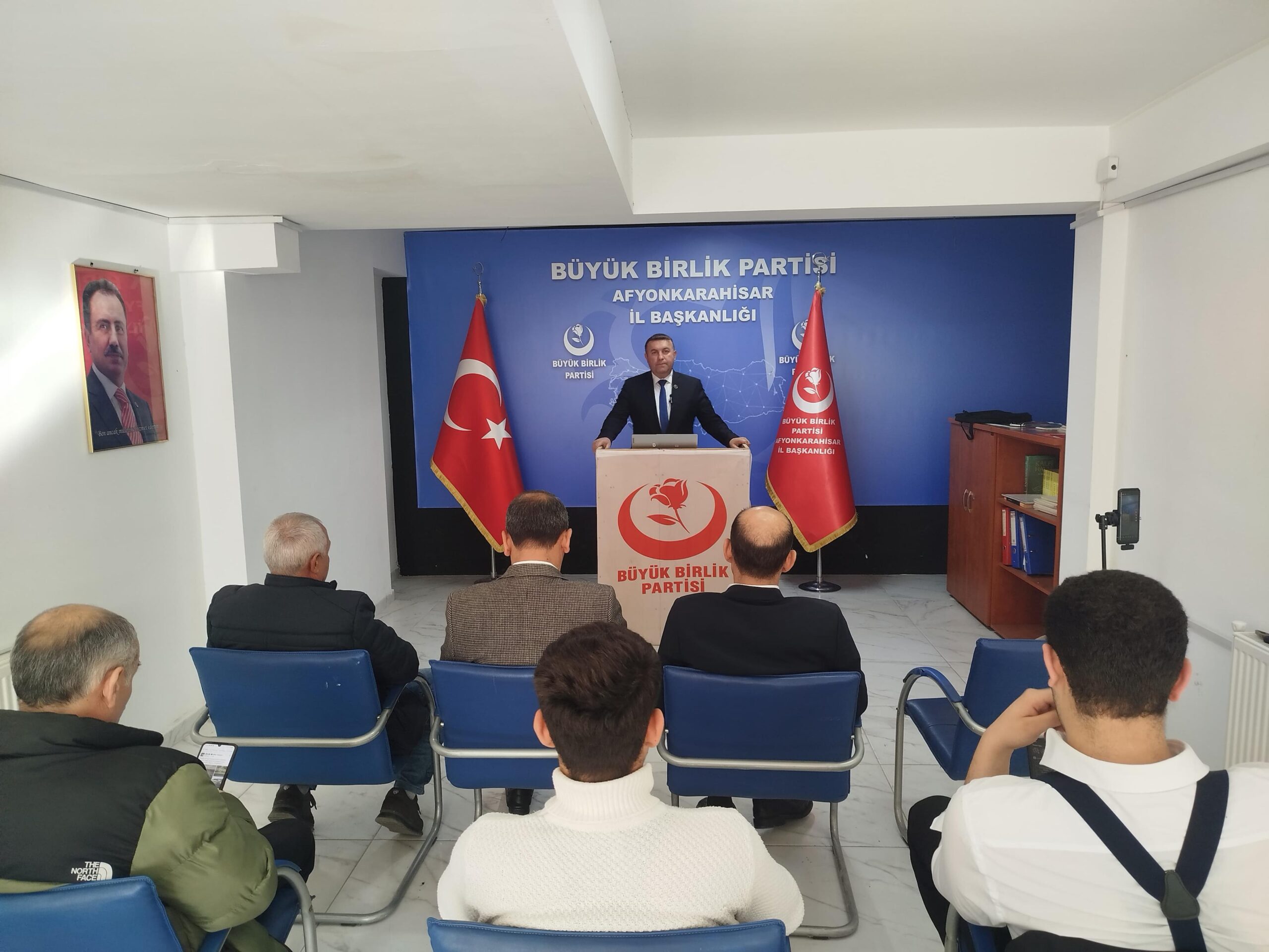 Büyük Birlik Partisi Afyonkarahisar İl Başkanı Süleyman Çağlar, parti il binasında açıklamalarda bulundu. Partililerin katıldığı toplantıda konuşan Çağlar, “Üç gün önce eğitim uçuşu yapan iki helikopterin çarpışması sonrasında 6 askerimiz şehit oldu. Isparta Kara Havacılık Okul Komutanı Tuğgeneral İsa Baydilli ve beş askerimize Allah’tan rahmet yakınlarına ve milletimize başsağlığı dileriz” dedi.