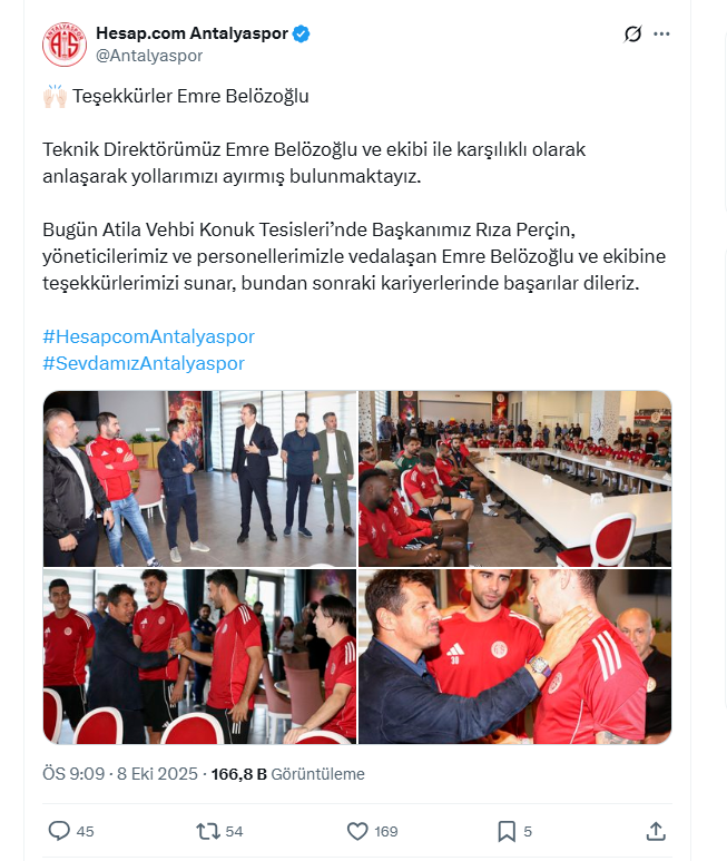 Antalyaspor’dan yapılan açıklamada “Teknik direktörümüz Emre Belözoğlu ve ekibi ile karşılıklı olarak anlaşarak yollarımızı ayırmış bulunmaktayız. Bugün Atilla Vehbi Konuk Tesisleri’nde başkanımız Rıza Perçin, yöneticilerimiz ve personellerinizle vedalaşan Emre Belözoğlu ve ekibine teşekkürlerimizi sunar, bundan sonraki kariyerlerinde başarılar dileriz.” ifadelerine yer verildi.