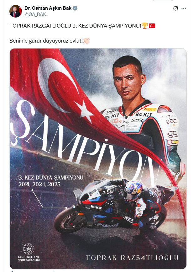 “Milli motosikletçimiz Toprak Razgatlıoğlu, Dünya Superbike Şampiyonası’nda üst üste ikinci, kariyerinde ise üçüncü kez dünya şampiyonu olarak bizleri bir kez daha gururlandırdı. 2025 Dünya Superbike Şampiyonu olarak ünvanını koruyan Toprak Razgatlıoğlu’nu tebrik ediyorum. Ülkemizi her zaman en iyi şekilde temsil eden sporcumuza, bu büyük başarısında emeği geçen herkese teşekkür ediyor, Toprak Razgatlıoğlu’na nice zaferlerle dolu bir kariyer diliyorum.”
