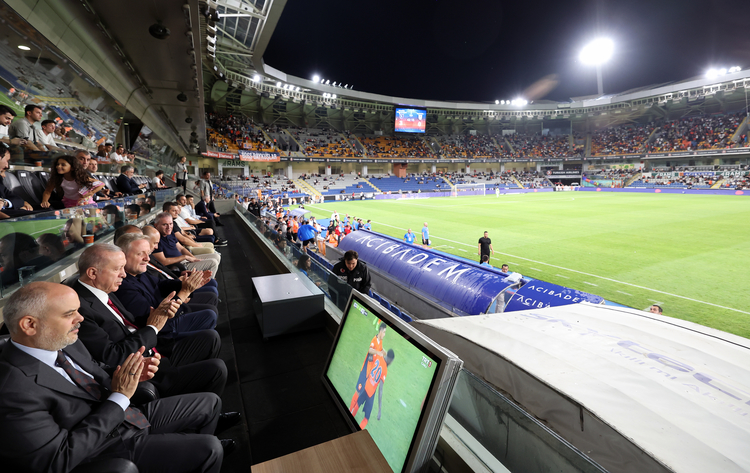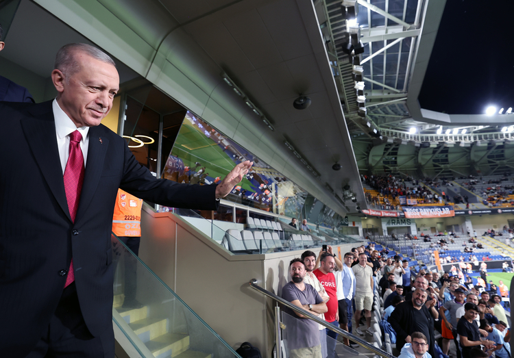 Cumhurbaşkanı Recep Tayyip Erdoğan, RAMS Başakşehir ile San Marino ekibi La Fiorita’nın UEFA Avrupa Konferans Ligi 2. eleme turu mücadelesini izledi. Başakşehir Fatih Terim Stadyumu’ndaki karşılaşmayı takip eden Erdoğan’a, Cumhurbaşkanı Dış Politika ve Güvenlik Başdanışmanı Akif Çağatay Kılıç ile RAMS Başakşehir Kulübü Başkanı Göksel Gümüşdağ eşlik etti. Erdoğan’ın, ilk yarıyı rakibi karşısında üstün tamamlayan RAMS Başakşehir futbolcularını alkışladığı görüldü.>>> AA