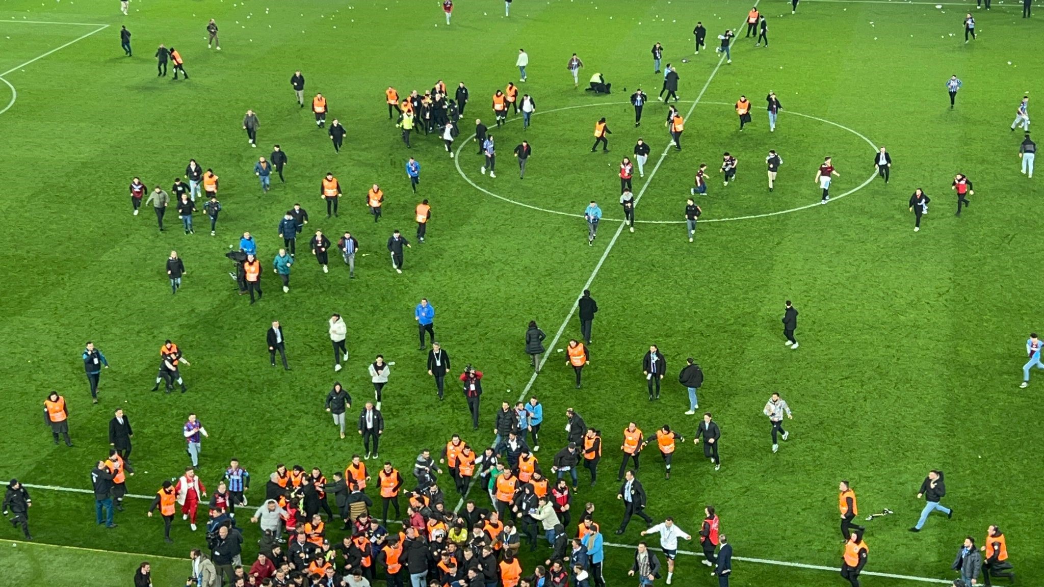 Trendyol Süper Lig’in 30. haftasında Fenerbahçe konuk olduğu Trabzonspor’u 3-2’lik skorla mağlup etti. Müsabakanın ardından sarı-lacivertli futbolcular, sahanın ortasında toplandı ve galibiyeti kutladı. Bu sırada bordo-mavili taraftarlar sahaya girdi. Daha sonra Trabzonsporlu taraftarlarla, Fenerbahçeli futbolcular arasında gerginlik yaşanırken, güvenlik güçleri olayları engellemekte zorlandı. Fenerbahçeli futbolcular olayların ardından soyunma odasına doğru gitti.