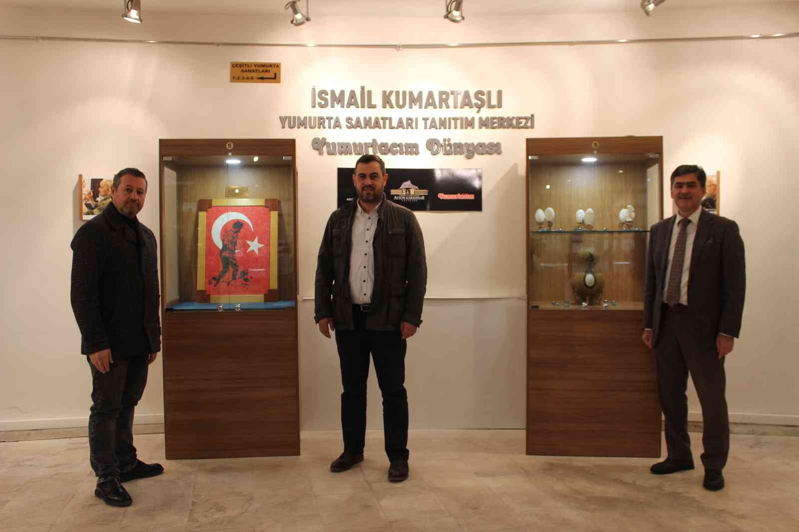 “Burada 240 canlı ırkının yumurtasını ve 9 şehirden 10 sanatçının eserlerini görüyoruz. Burada yumurtalarda oyma ve boyama tekniği uygulanarak ortaya çıkan eserler var. İçerisinde bulundurduğu eserlerden dolayı çok özellikle bir müzeden bahsediyoruz. Müzenin bir başka boyutu ise İsmail Kumartaşlı’nın oğlu Mehmet Kumartaşlı tarafından sponsorluk desteği olan, yani özel sektörle kamu işbirliği ile kurulan bir müze olması sebebiyle de önemli bir müze. Burada tavuklar ile ilgili yumurtaları bulundururken, bunun yanında vahşi ırklara ait yumurtaları da müzede sergileyerek halkımızla buluşturduk. Müzede yer alan yumurtaların içerisinde oyma ve boyama sanatları var. Anadolu’nun motiflerini bu eserlerde sanatçılarımız işlemişler.”