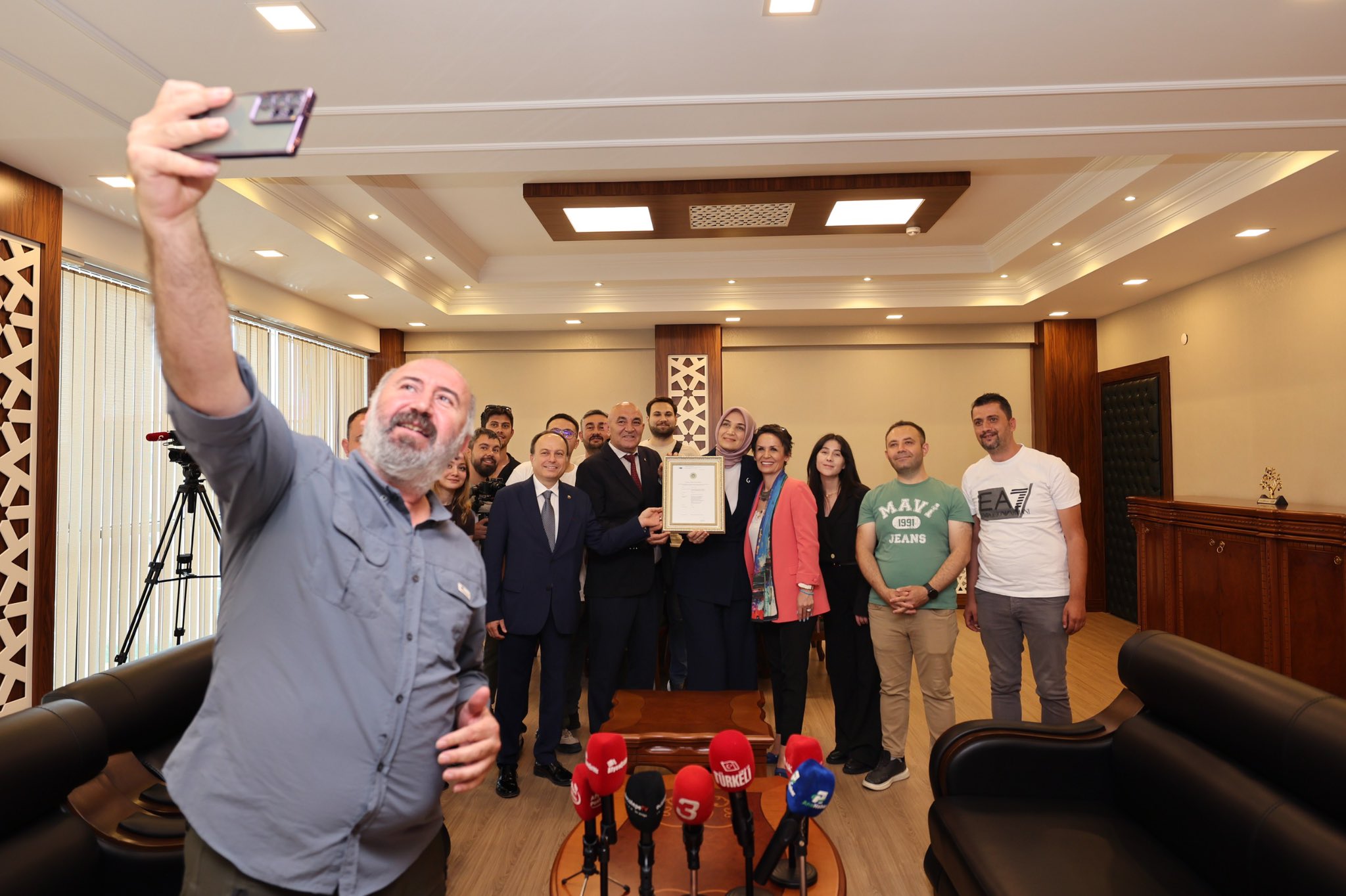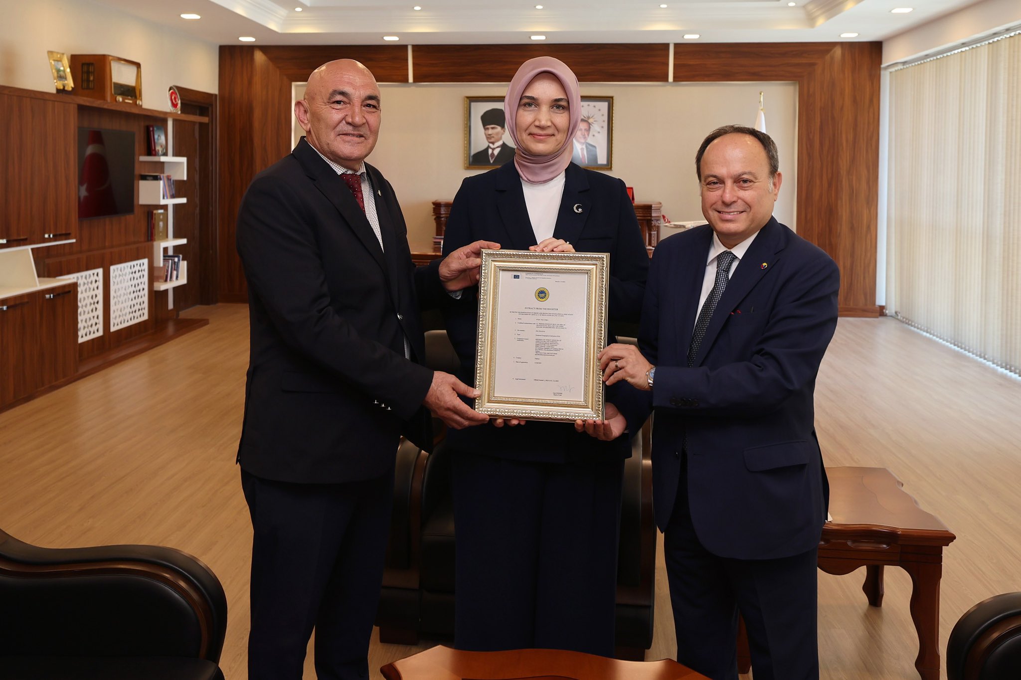 Vali Kübra Güran Yiğitbaşı’na, AB Coğrafi İşaret Tescil Belgesi, Afyonkarahisar Ticaret Borsası Başkanı Mehmet Mühsürler ve Afyonkarahisar Ticaret ve Sanayi Odası Başkanı Hüsnü Serteser tarafından takdim edildi.