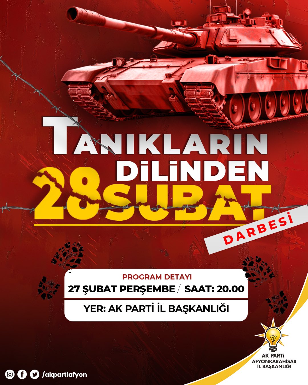 AK Parti Afyonkarahisar İl Başkanlığı, 28 Şubat sürecinde yaşananları ‘TANIKLARIN DİLİNDEN 28 ŞUBAT!’ konulu programda irdeleyecek.