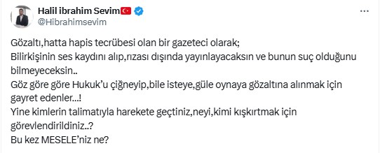 AK Parti Afyonkarahisar İl Tanıtım Medya Başkanı Halil ibrahim Sevim, gazetecilerin gözaltına alınmasına dair sosyal medya hesabından paylaşım yaptı.