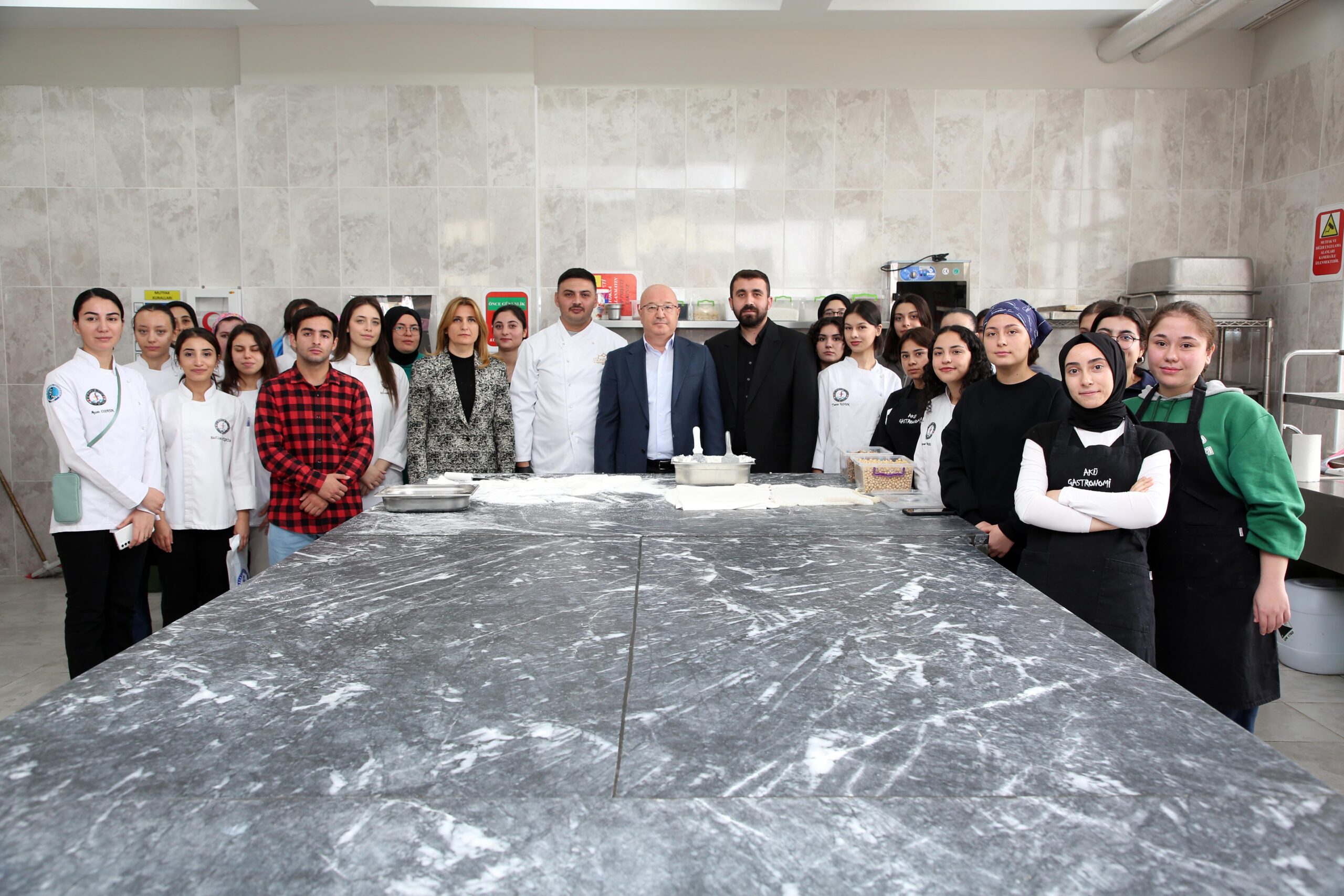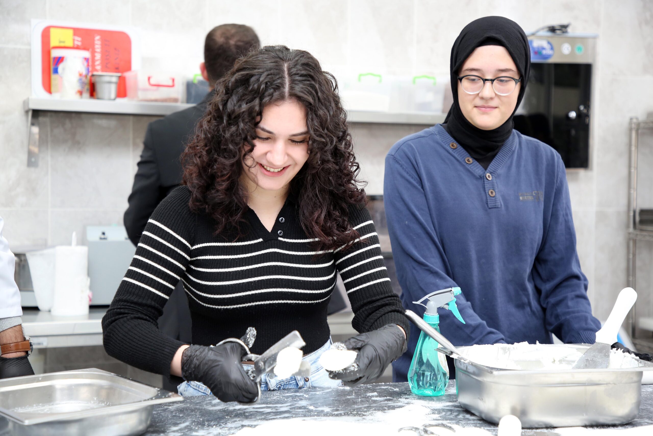 Turizm Fakültesi Pasta ve Unlu Mamüller Mutfağında düzenlenen etkinlikte; Gönbeler Lokumculuk Yönetim Kurulu Başkanı Fatih Gönbe, lokumun tarihini ve yapım aşamalarını öğrencilerle paylaştı. Lokumun tarihi ile ilgili bilgiler aktaran Gönbe, “Lokumun tarihinin seyyahların yazılarında 15. yüzyıla kadar indiğini biliyoruz. Ancak şu anki lokum hamurları ve reçete maddeleri gibi değil, daha farklı bir üretim tekniğiyle üretilmekteydi. Lokumun reçetesinde bulunan 4 ana madde, o zaman için yoktu. Çünkü şeker pancarı, şeker pancarından üretilmiş şeker henüz icat edilmediği için bal ile lokum yapılmaktaydı. Osmanlı Dönemine geldiğimiz zaman 15. yüzyıldan 16. yüzyıla kadar olan bölümde şu an ismini bildiğimiz Bekir Efendinin Osmanlı Sarayına girmesiyle bizim tükettiğimiz lokumun reçetesi icat edilmiş oldu. Bekir Usta lokumu, Osmanlı Mutfağına getirdiğinde lokumu; şeker, su, mısır nişastası ve içinde kullandığı kuruyemişlerden oluşturuyordu” diye konuştu.
