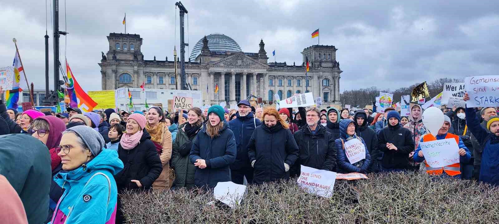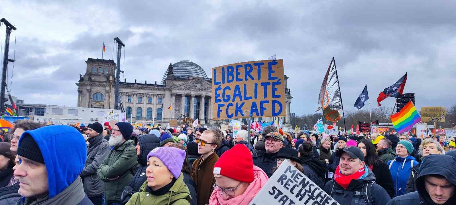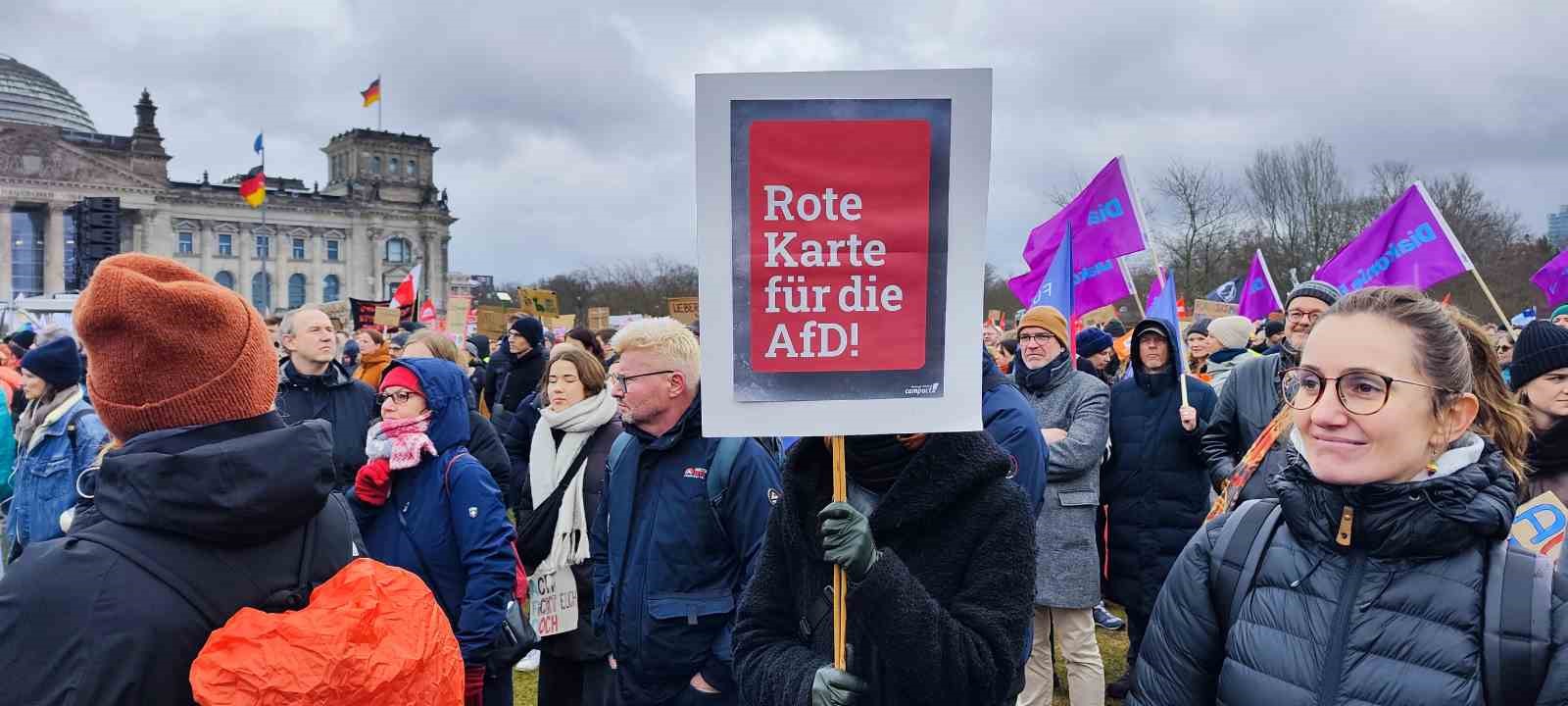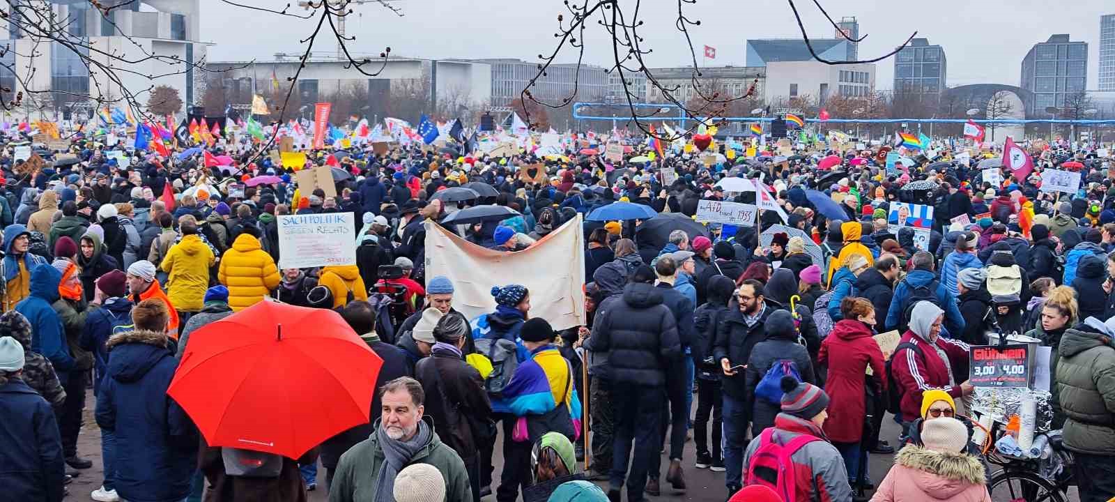 Almanya’da aşırı sağcı AfD (Almanya için Alternatif) Partisi ve ırkçılığa karşı protestolar sürüyor. AfD Partisi‘nin ülkedeki bütün yabancıları sınır dışı etme planının ortaya çıkmasının ardından başlayan protestoların devamı olarak bugün başkent Berlin’de çoğu Alman 150 bin kişinin katıldığı bir miting gerçekleştirildi.