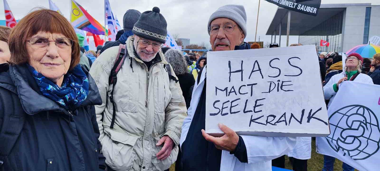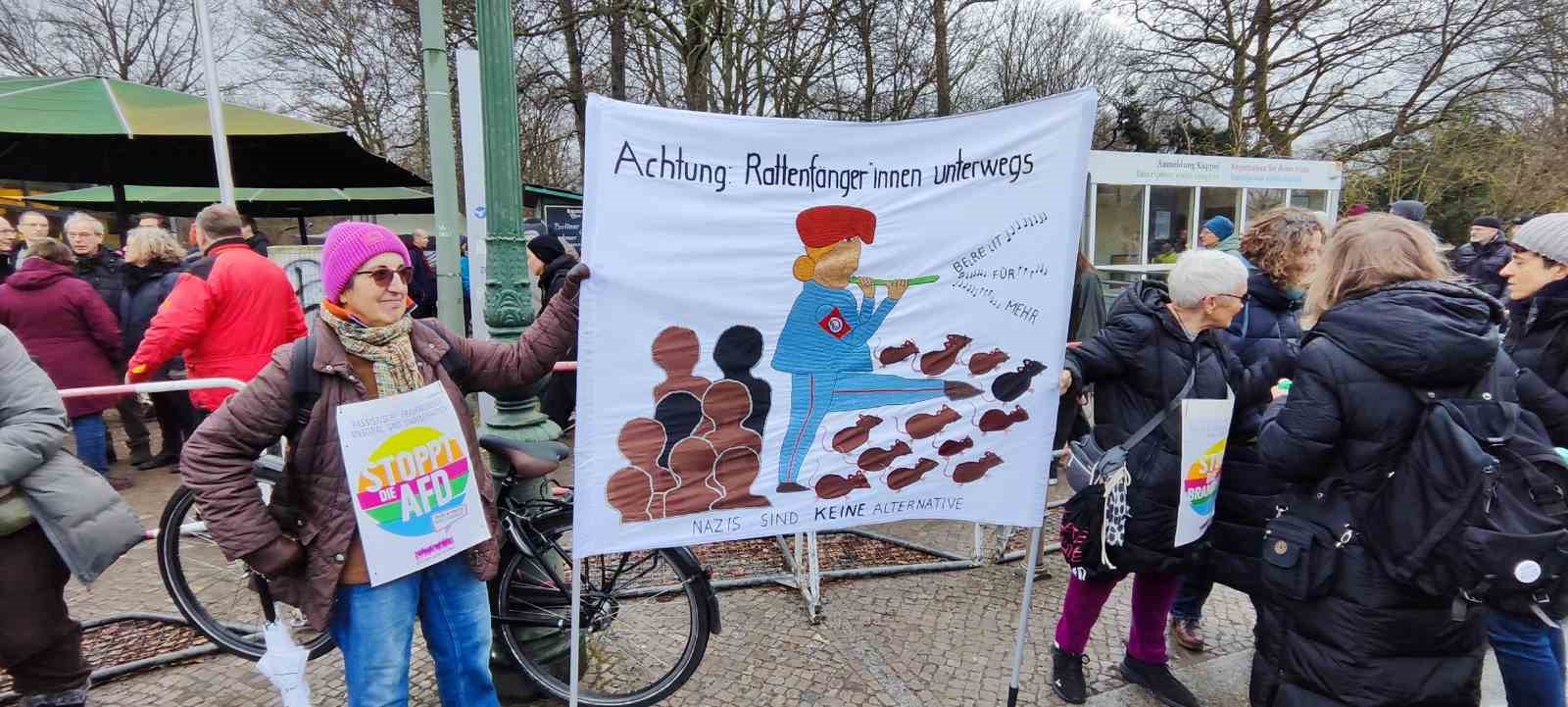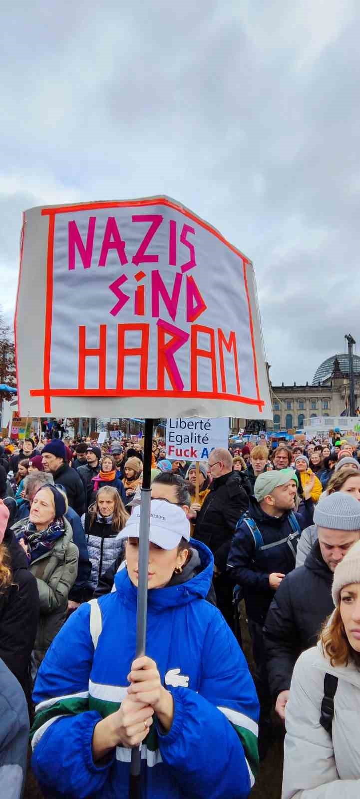 Başbakanlık Binası ile Federal Meclis Binası arasındaki alanda “El Ele” sloganıyla bir araya gelen göstericiler, üzerinde “Artık Nazilere hiçbir zaman iktidar yok”, “Bütün Berlin Nazilerden nefret ediyor”, “Biz güvenlik duvarıyız”, “AfD alternatif olamaz” yazan pankartlar taşıdı. Genç bir eylemcinin taşıdığı “Naziler Haram” yazan pankart ise dikkat çekti.