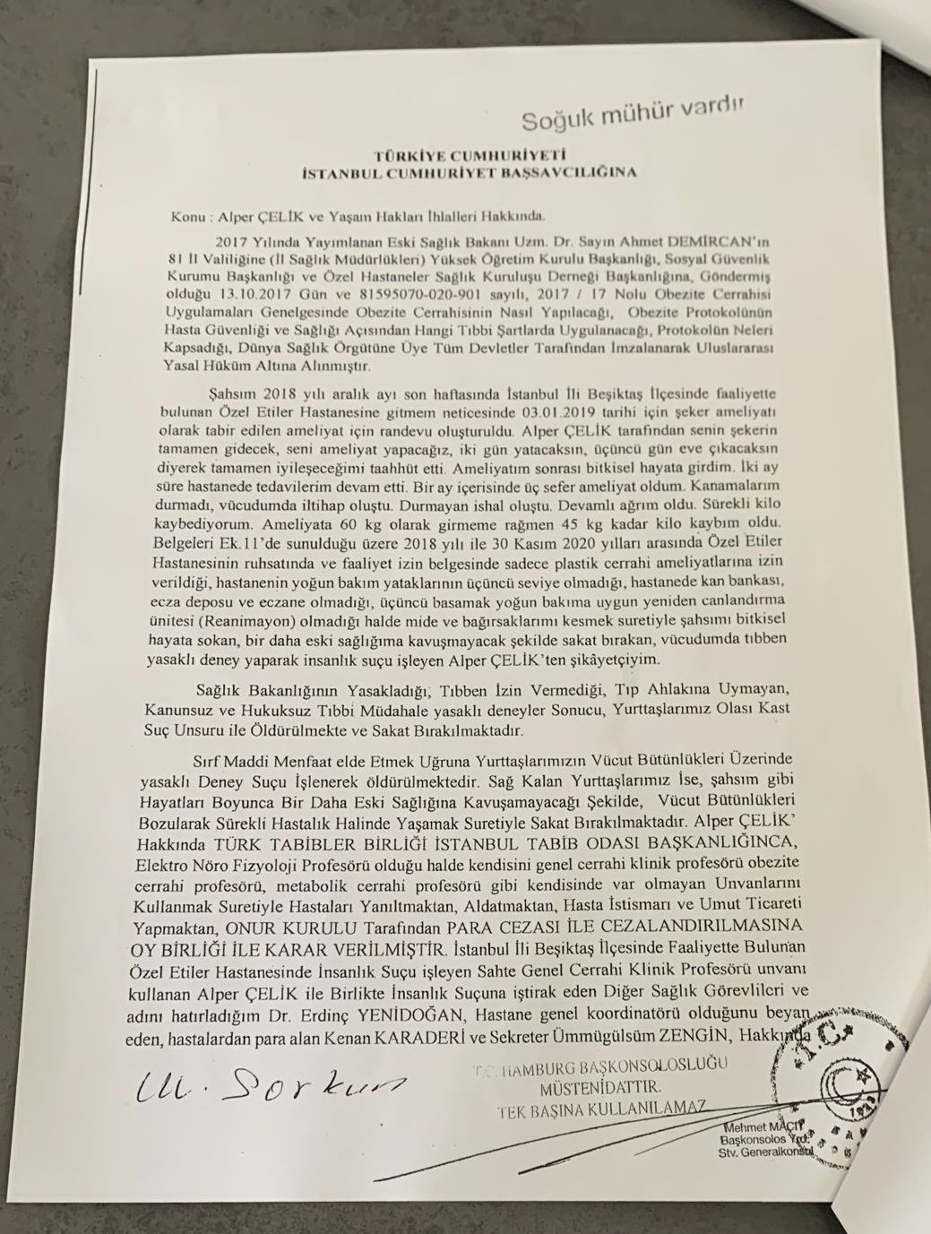 Alper Çelik’i televizyon reklamlarında gördüğünü ve sadece danışmak için yanına gittiğini belirten Makbule Sorkun “Önce danışmak için gittim kendimi bir anda ameliyat masasında buldum. Aslında buna ameliyatta demeyeyim, deneme diyeyim. Hastaneye şekerim için gitmiştim. Dr. bana ‘şekeriniz gidecek, siz iyileşeceksiniz. İki gün kalıp üçüncü gün çıkacaksınız’ dedi. Ve ben o hastaneden tam 2 ay çıkamadım. Üç kere ameliyat oldum. Sonra Almanya’ya geldim, Almanya’da da ameliyat oldum. Onun yaptığı hatalardan dolayı zayıflıyorum, kilo alamıyorum, yemek yiyemiyorum. Bende ağrı, halsizlik, kas kaybı, hepsi bende oluştu. Tekrar ameliyat oldum. Geçtiğimiz günlerde tekrar hastaneye yattım. Ev doktorlarına gidiyorum, değişen bir şey yok. Alper Çelik’in deneme yaptığı hatalarını bir türlü düzeltemiyorlar” ifadelerini kullandı.