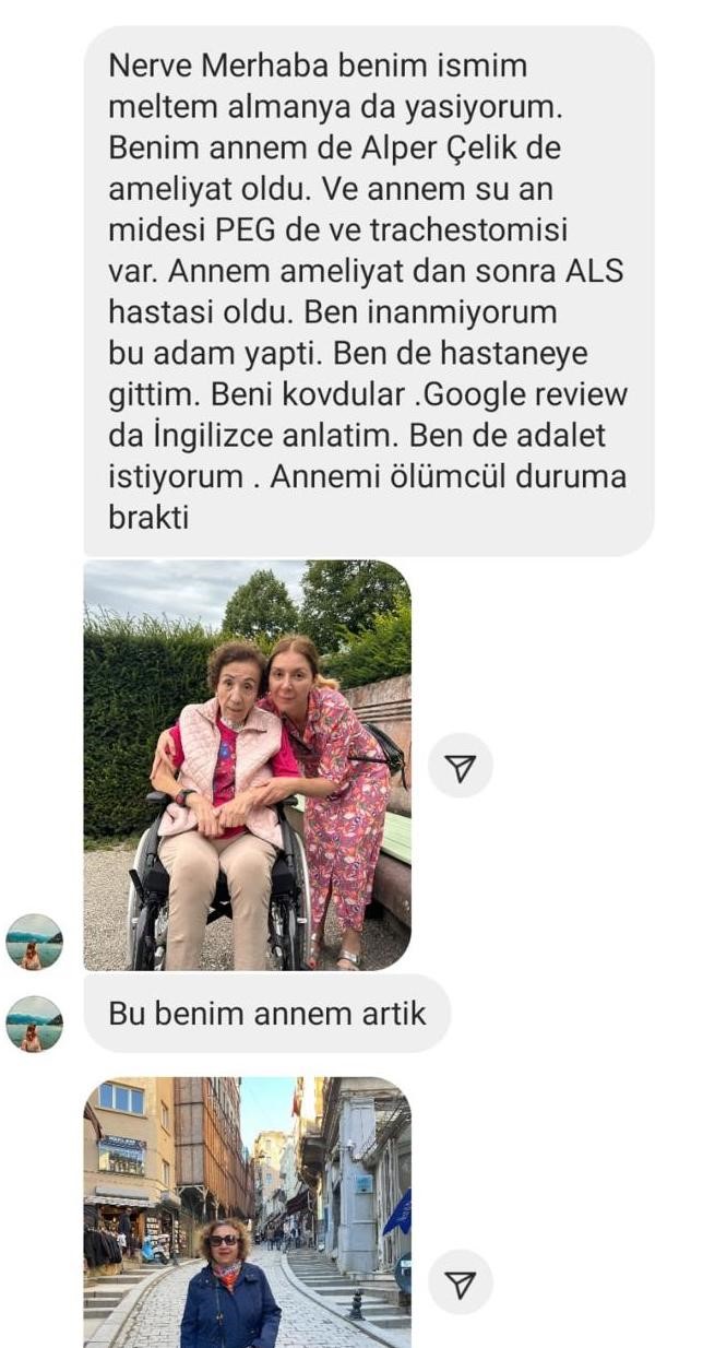 Dr. Alper Çelik Etiler’de özel bir hastanede bu işlemleri yaptığını söyleyen Sorkun, “Bu adam tek başına değil, yanında Erdinç bey, Kenan bey, Gülsüm hanım var. Bunlar birlikte insanları kesip kesip ölüme terk ediyorlar. Buna ameliyat denilmez. Bu bir denemedir. Almanya’daki insanları da uyarıyorum. İnsanların paralarını alıp kandırıyorlar. Ölenleri de gördüm, orada neler gördüm neler. İnsanları uyarıyorum. Ben de sakat kaldım, düzeltemiyorlar. Yiyemiyorum, sürekli geriliyor her şey. Psikolojim bozuldu. Ev işi de yapamıyorum, hep eşim yardımcı oluyor” dedi.