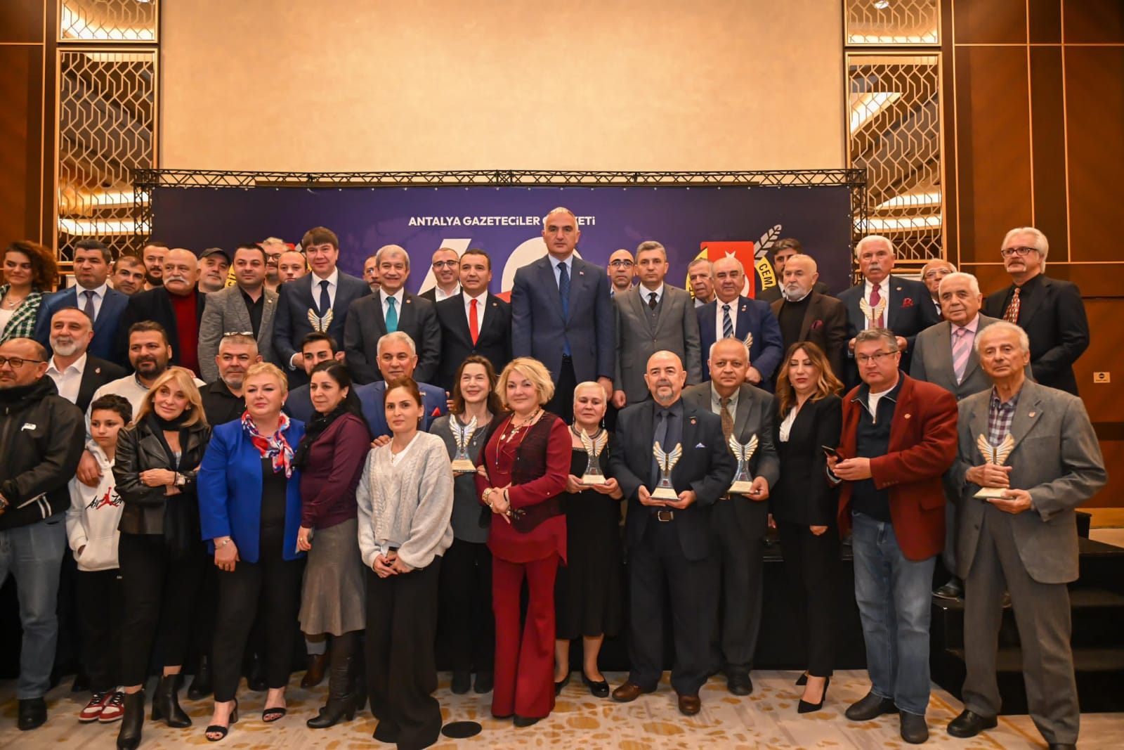 Kültür ve Turizm Bakanı Ersoy, Vali Şahin, Antalya Gazeteciler Cemiyeti’nin 40’ıncı kuruluş yıl dönümü etkinlikleri kapsamında düzenlenen törende, üyelikte 40 yılı dolduran 19 üyeye plaketlerini takdim etti.