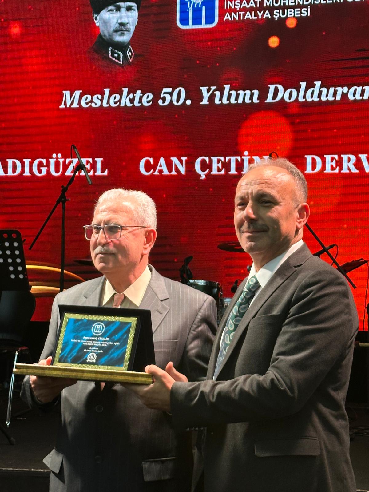 Türkiye’de odalara kayıtlı 175 bin, Antalya’da da 7 bin inşaat mühendisi olduğunu söyleyen Akdoğan, “Bugün mesleğinde 25, 40, 50 ve 60. yılını dolduran kıymetli meslektaşlarımız için anlamlı bir gün. Bir çırpıda ifade ettiğimiz bu yıllar; emekle, fedakârlıkla ve zorluklarla dolu, yaşamları kolaylaştıran değerli eserlerin üretildiği yıllardır. Mesleğimizin ustalarına, üstatlarına ve emektarlarına en içten teşekkürlerimi sunuyorum” dedi.