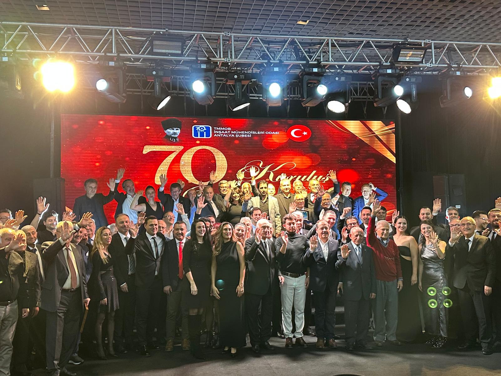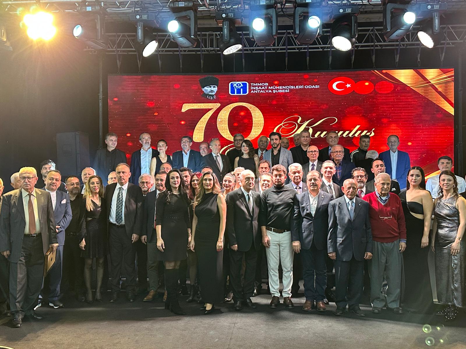 İnşaat Mühendisleri Odası Antalya Şubesi, meslek odasının 70’nci, Antalya şubesinin 36’ncı kuruluş yıl dönümünü gala gecesiyle kutladı. Sayın Grubu’nun da sponsor olduğu gecede, meslekte 25, 40, 50 ve 60 yılı geride bırakan oda üyesi inşaat mühendisleri plaketle ödüllendirildi. Şube Başkanı Mehmet Soner Akdoğan, Türkiye genelinde 175 bin, Antalya’da ise 7 bin meslektaşlarını olduğunu söyledi, “Mesleğimizin ustalarına, üstatlarına ve emektarlarına en içten teşekkürlerimi sunuyorum” dedi.