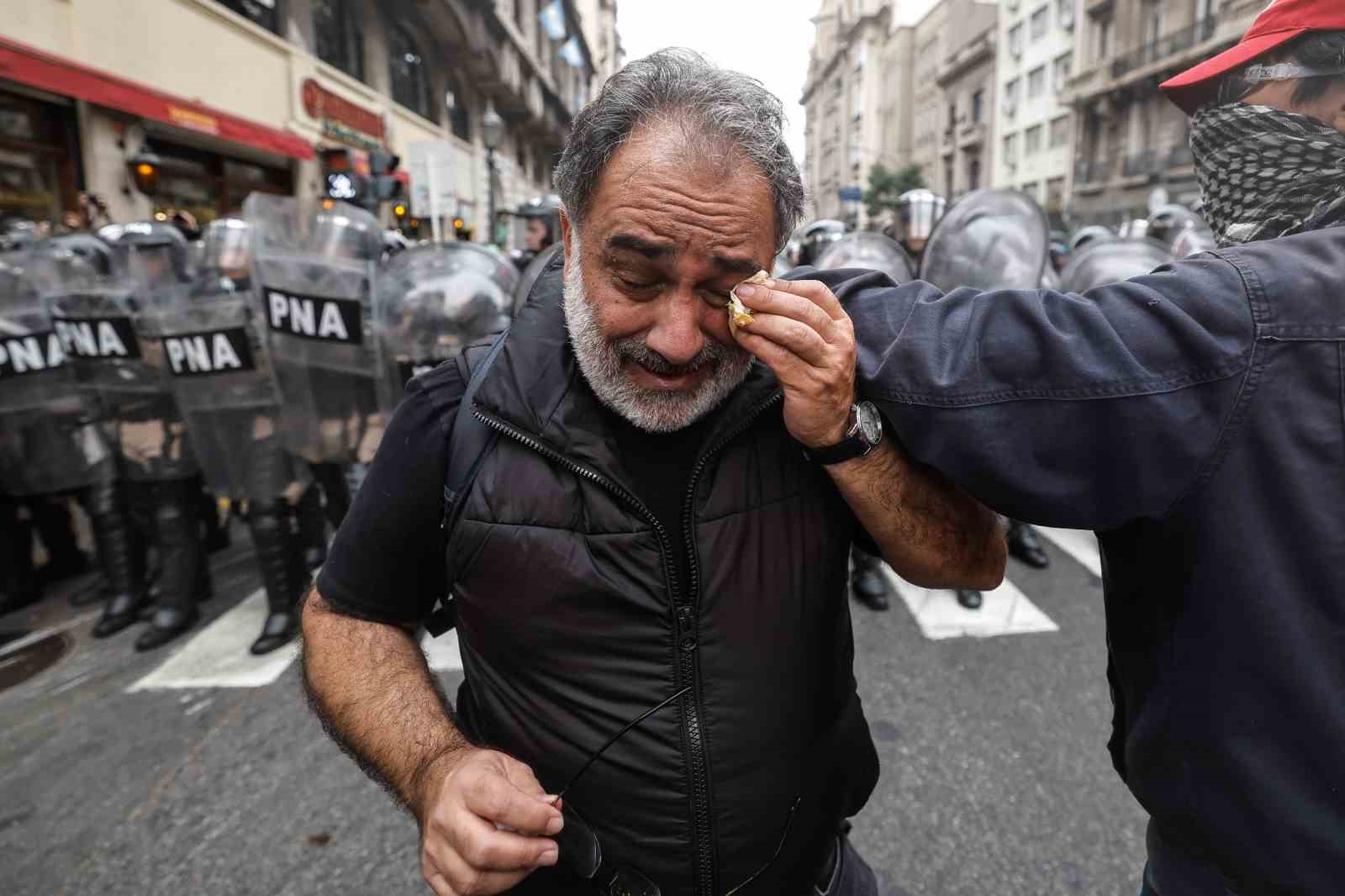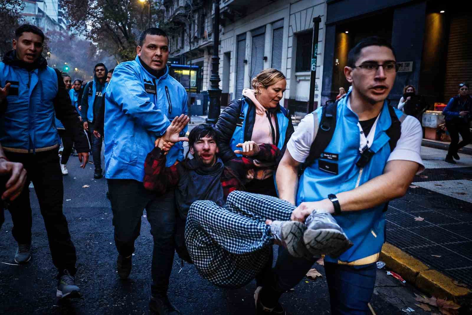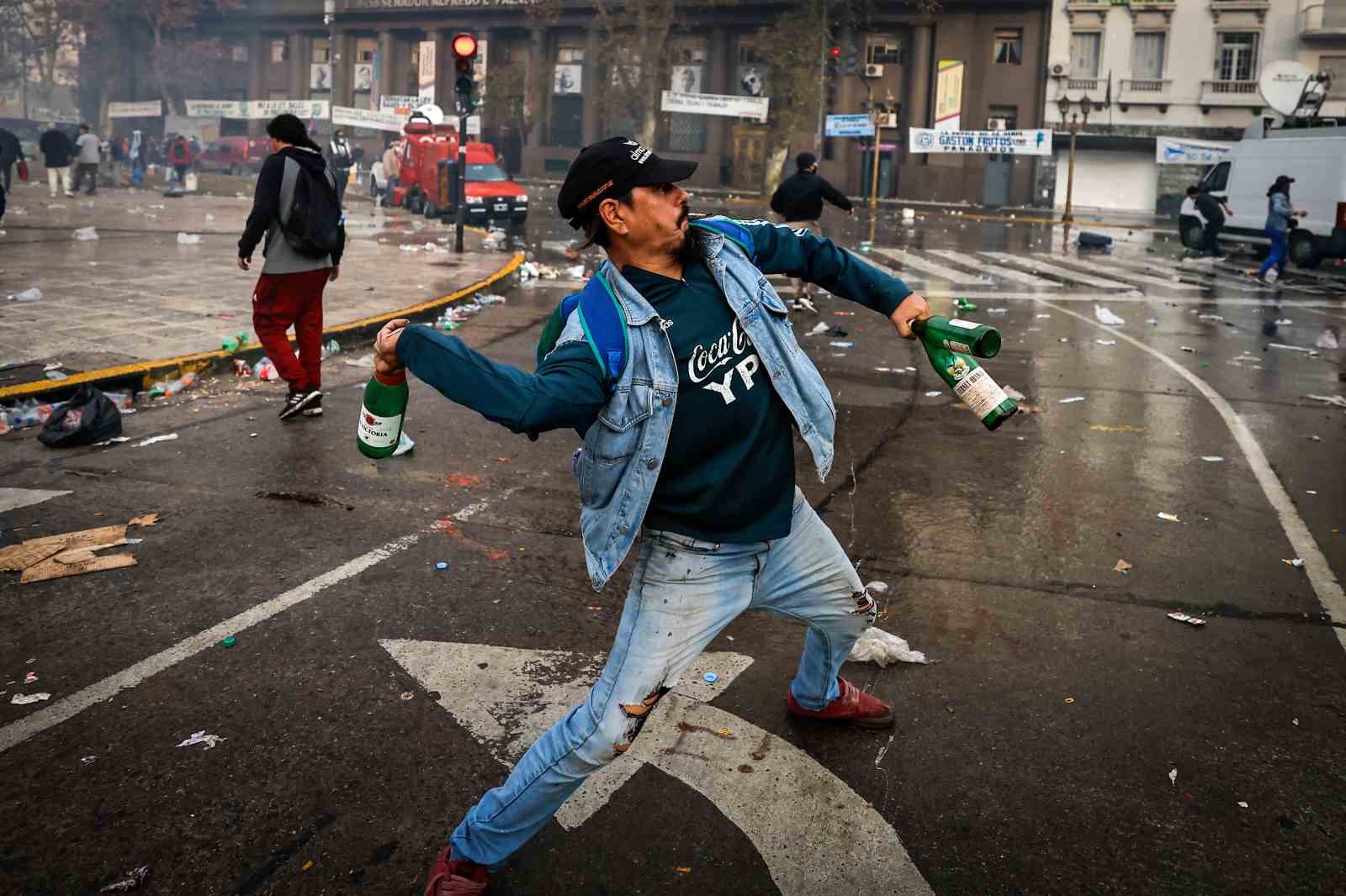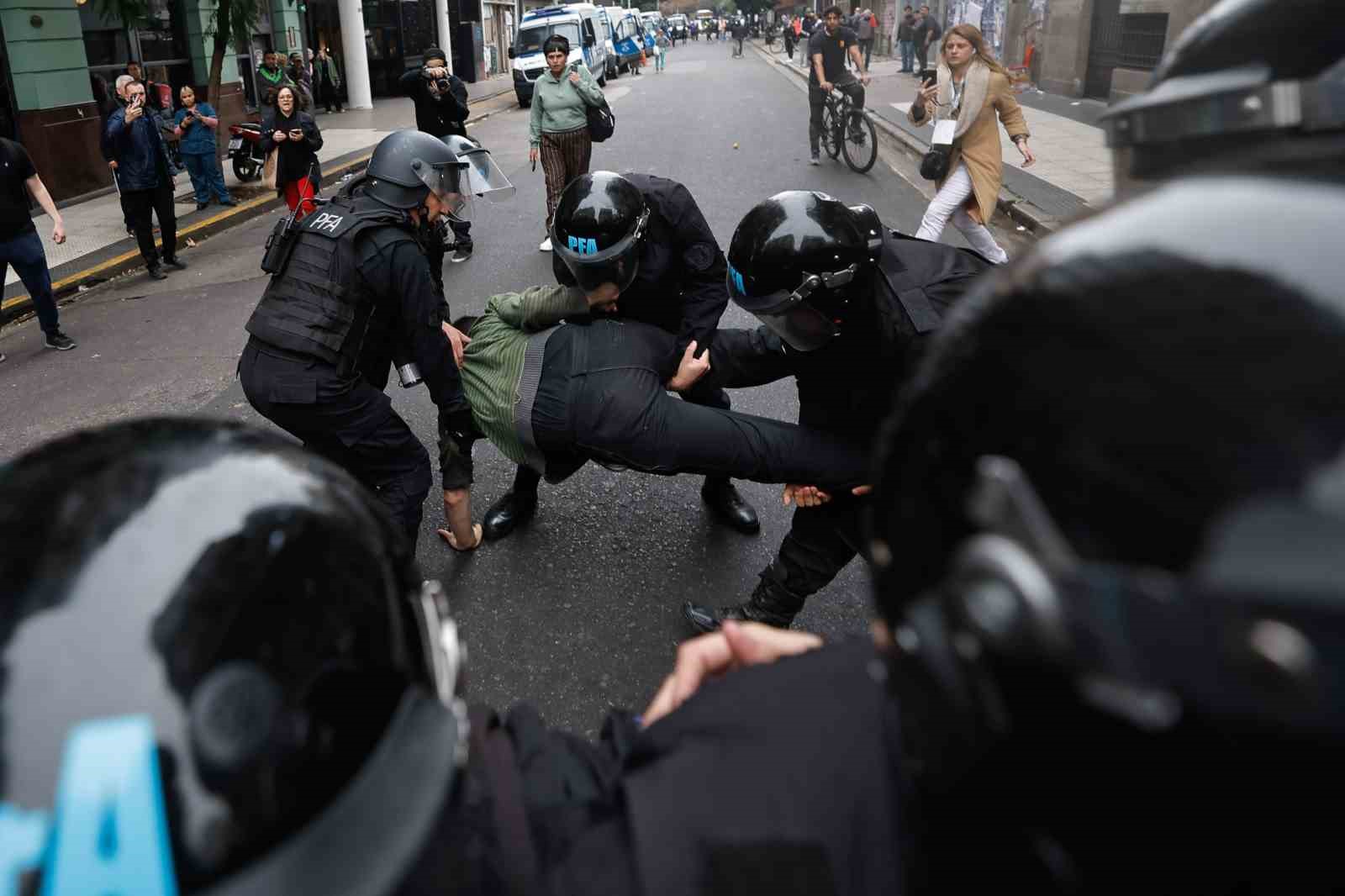 Arjantin’de Devlet Başkanı Javier Milei hükümetinin ekonomik reform paketi nedeniyle binlerce kişi sokaklara döküldü. Reformun halka zarar vereceğini belirten göstericiler, “Ülkemiz satılık değil” sloganları atarak paketin görüşüldüğü Kongre’ye yürüdü. Ancak polisin müdahalesi gecikmedi. Göstericiler göz yaşartıcı gaz ve tazyikli su kullanan polise taş ve molotof kokteyli attı, ortalık savaş alanına döndü. Polisin gazlı müdahalesinden etkilenen 5 muhalif milletvekili hastaneye kaldırıldı. Onlarca kişiye ise olay yerinde tıbbi müdahale yapıldı. Yetkililer, çıkan çatışmada en az 20 polisin yaralandığını, 15 kişinin gözaltına alındığını, ayrıca göstericilerin 2 aracı ateşe verdiğini belirtti.