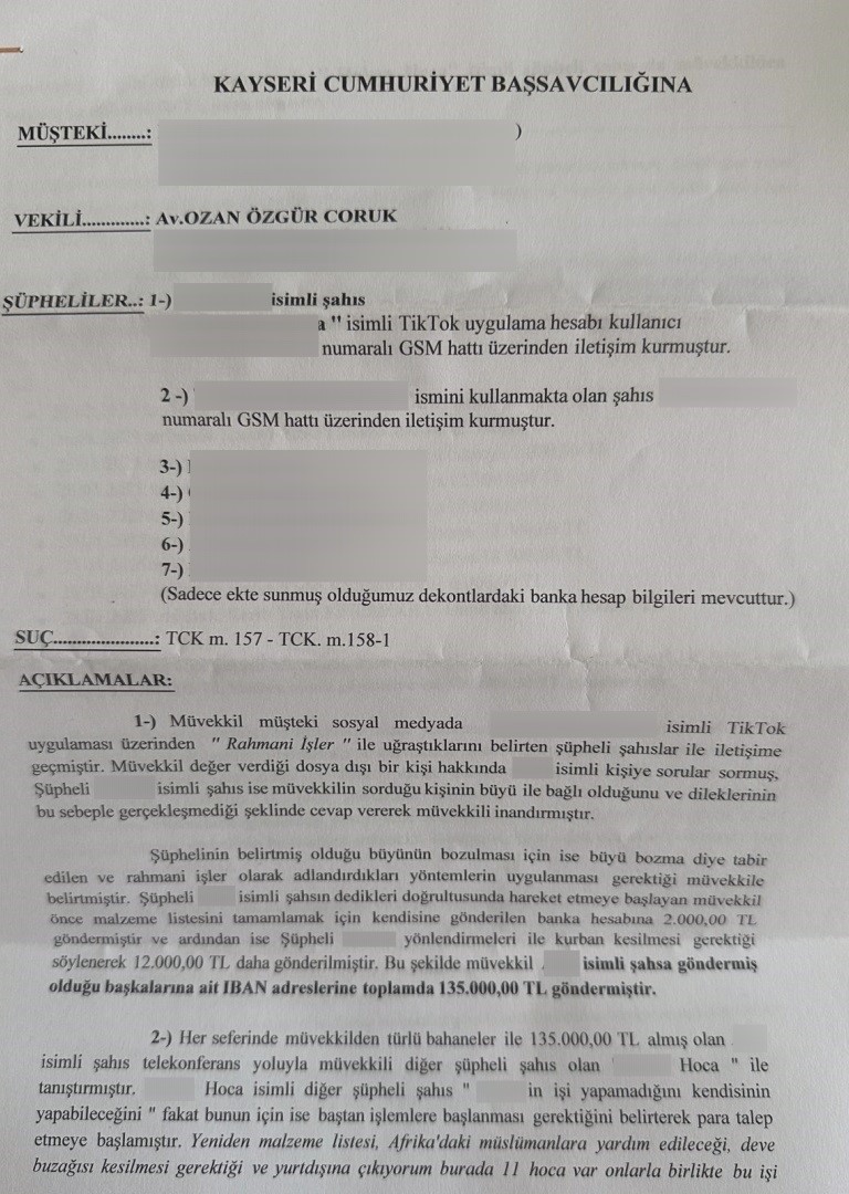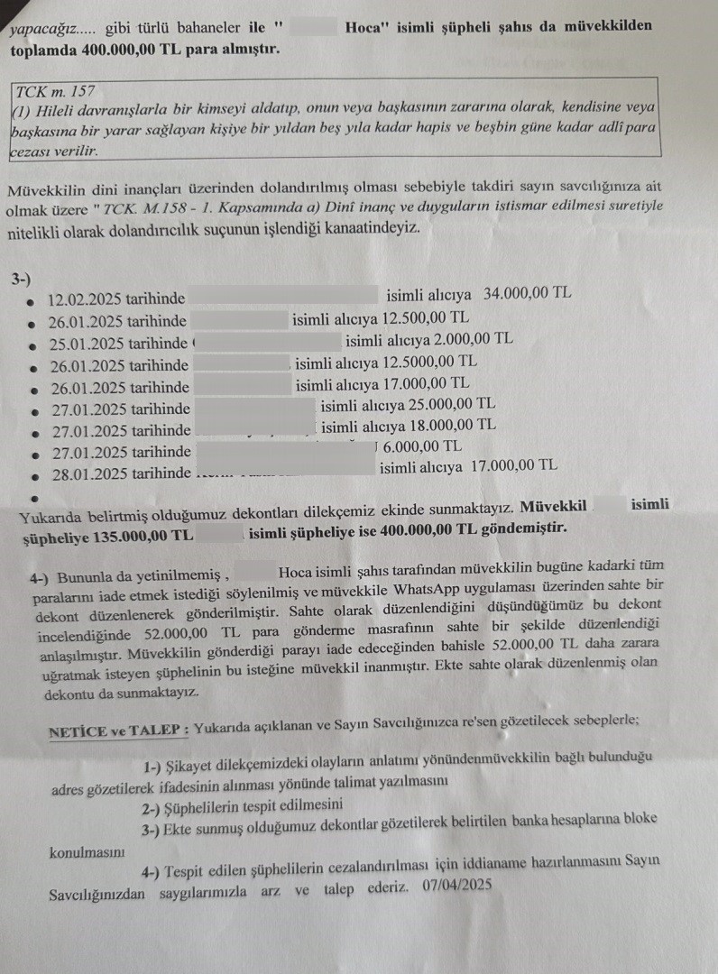 Avukat Ozan Özgür Coruk, müvekkilinin dini inançlarının suistimal edildiğini belirterek olayın nitelikli dolandırıcılık suçu kapsamında değerlendirildiğini söyledi. Hesapların büyük ihtimalle kiralık ve sahte olduğunu vurgulayan Coruk, vatandaşları sosyal medya dolandırıcılıklarına karşı uyardı.