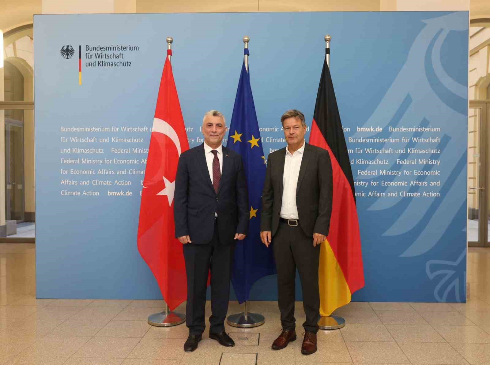 Ticaret Bakanı Ömer Bolat, Türkiye-Almanya Ekonomi ve Ticaret Ortak Komitesi (ETOK/JETCO) 5. Dönem Toplantısı’na katılmak üzere Berlin’e geldi. Bakan Bolat, temasları kapsamında Almanya Ekonomi ve İklim Koruma Bakanı Dr. Robert Habeck ile görüşme gerçekleştirdi. Bolat sosyal medya hesabından yaptığı paylaşımda, “Bugün Türkiye-Almanya Ekonomi ve Ticaret Ortak Komitesi (ETOK/JETCO) 5. Dönem Toplantısı’na katılarak Türkiye ile Almanya’nın ticari ilişkilerini ele almak ve iş dünyası temsilcileri ile bir araya gelmek üzere Berlin’deyiz. Ziyaretimiz kapsamında ilk olarak kıymetli mevkidaşım Almanya Ekonomi ve İklim Koruma Bakanı Sayın Dr. Robert Habeck ile yaptığımız ikili görüşmede, küresel gelişmeleri de değerlendirerek Türkiye ile Almanya arasındaki ikili ticaret hacmini 50 milyar dolardan 60 milyar dolara çıkarma hedefimizi, karşılıklı yatırımları artırmayı ve ticaretin önündeki engellerin kaldırılması konularını ele aldık” ifadelerini kullandı. Bolat, “Türkiye; Almanya ve 205 milyar dolarlık ticaret hacmine sahip olduğumuz Avrupa ülkeleri için üretim, yatırım, ihracat ve pazar büyümesinde önemli fırsatlar sunan güvenilir bir ortak olarak öne çıkmaktadır. Almanya ile iş birliği alanlarımızı çeşitlendirmek, Türkiye’nin AB tedarik zincirlerine olan yakınlığı ve entegrasyonu da dikkate alındığında her iki taraf için de önemli kazanımlar sunmaya devam edecektir” ifadelerine yer verdi.