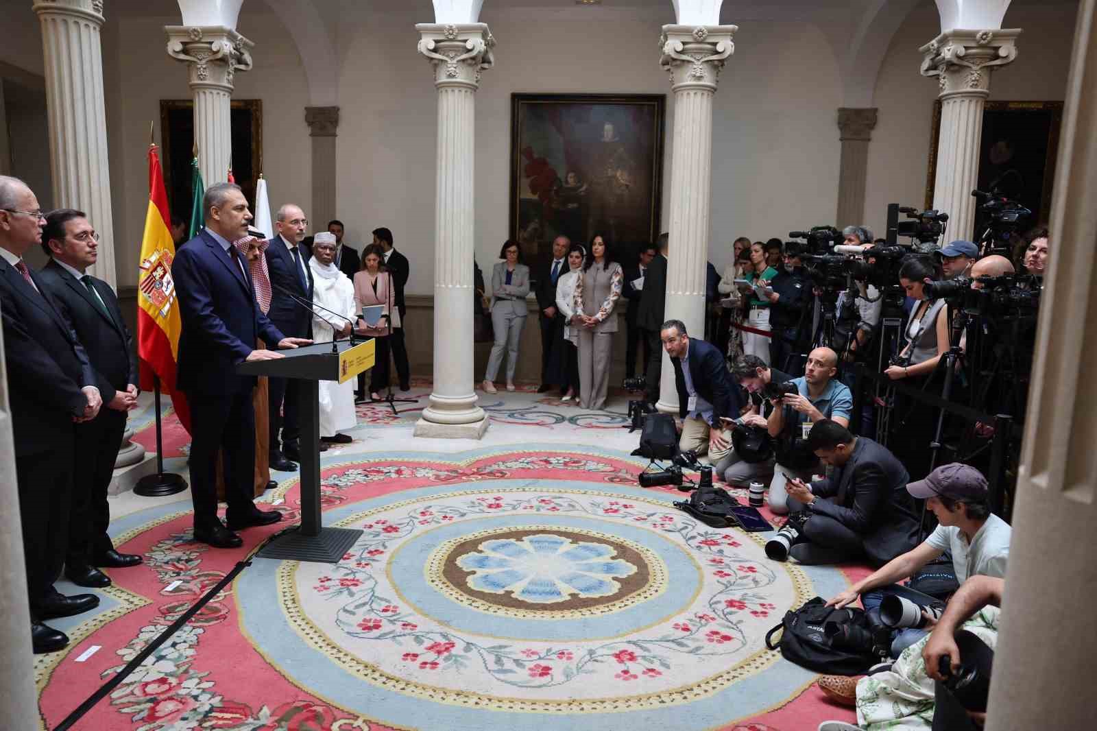 Dışişleri Bakanı Hakan Fidan, İslam İşbirliği Teşkilatı (İİT) ve Arap Birliği Gazze Temas Grubu üyeleri ile birlikte İspanya’nın Filistin devletini tanıma kararı vesilesiyle ilettiği davete icabetle Madrid’e geldi. Bakan Fidan ve beraberindeki Katar Başbakanı ve Dışişleri Bakanı Şeyh Muhammed bin Abdulrahman Al Thani, Suudi Arabistan Dışişleri Bakanı Faysal bin Farhan Al Saud, Ürdün Dışişleri Bakanı Ayman Safadi, İslam İşbirliği Teşkilatı Genel Sekreteri Hüseyin İbrahim Taha, La Moncloa Sarayı’nda İspanya Başbakanı Pedro Sanchez ile görüşme gerçekleştirdi. Bakan Fidan görüşmenin ardından İİT Temas Grubu ve İspanya Dışişleri Bakanı Jose Manuel Albares Bueno ile ortak basın açıklaması yaptı.
