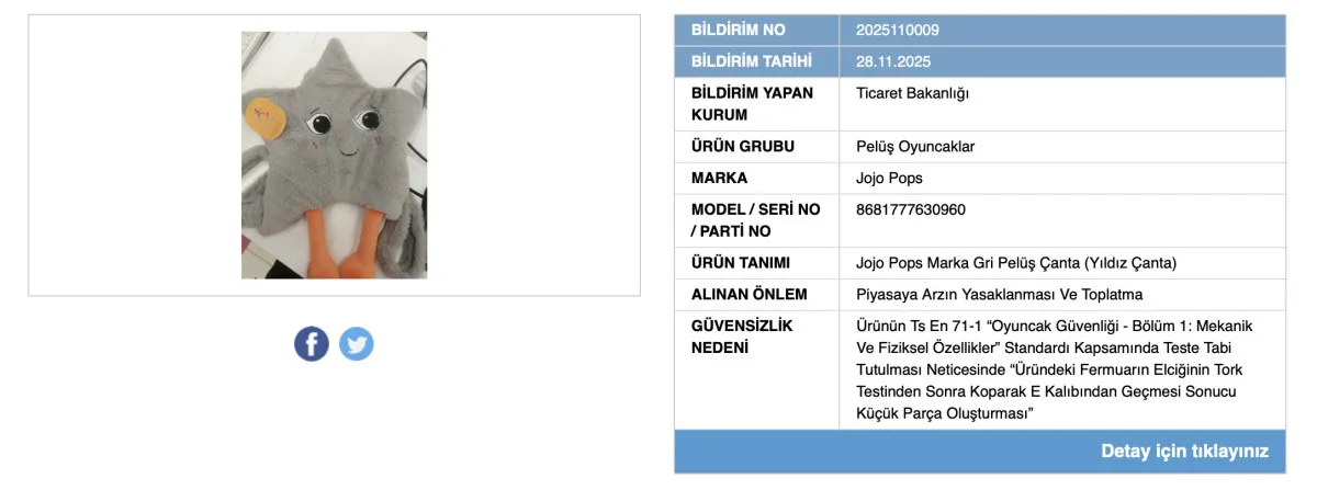 Yapılan incelemelerde, çocukların sıkça tercih ettiği Jojo Pops marka gri pelüş çantanın güvenlik standartlarını karşılamadığı ve boğulma tehlikesi oluşturduğu tespit edildi.