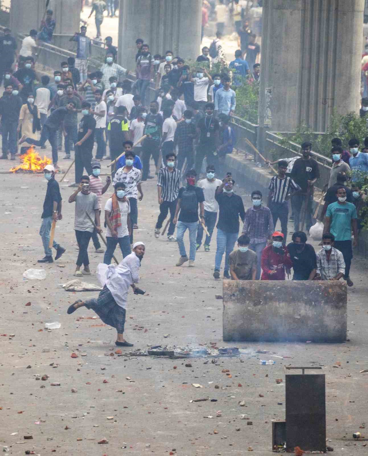 Başkent Dakka’da göstericiler polis araçları ve bir polis kulübesi ile yollara kurdukları barikatları ateşe verdi. Göstericiler ayrıca devlet televizyonu Bangladeş TV’nin merkez binasına saldırdı, ana kapıyı kırarak girişi ateşe verdi.