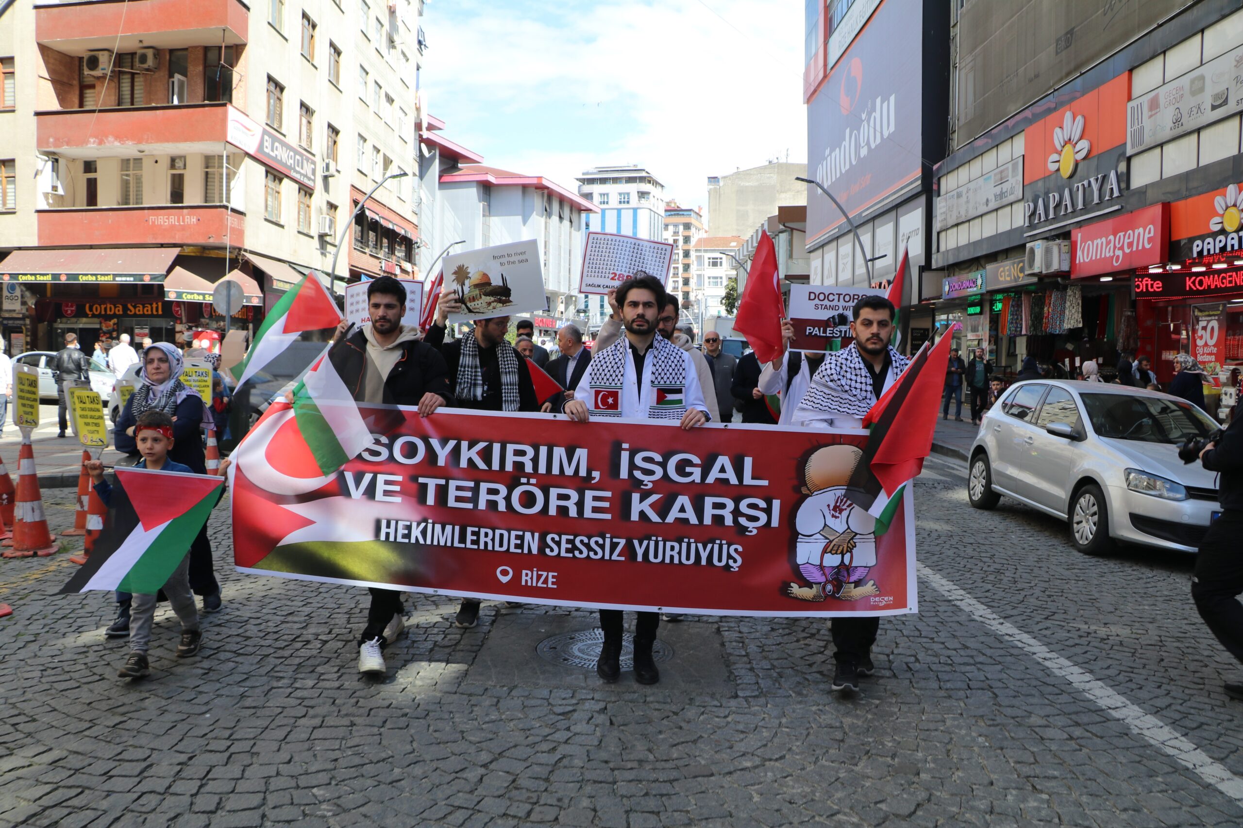 Rize’de tıp fakültesi öğrencileri ve sağlık çalışanları, İsrail’in Gazze’ye yönelik yaptığı saldırıları sessiz yürüyüş ile protesto etti.