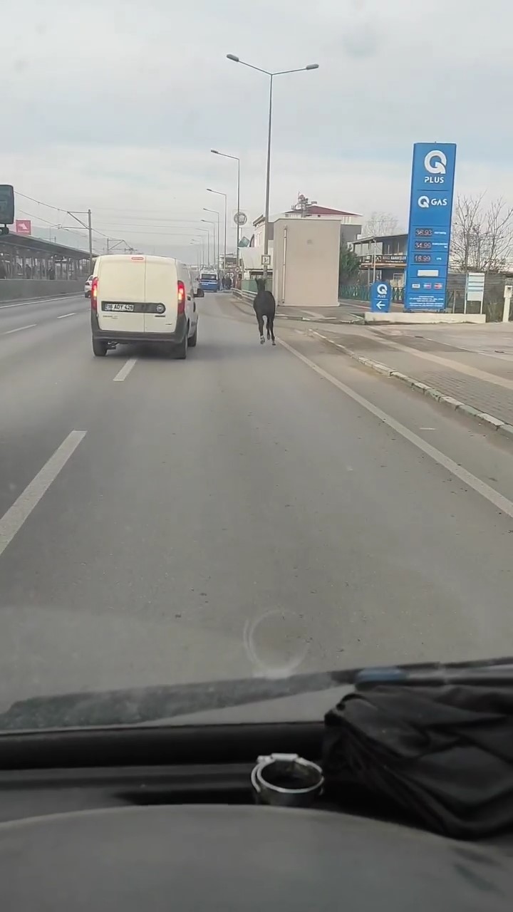 Bursa’da trafikte koşturan başıboş tay vatandaşlar tarafından kaydedildi. Adeta araçlarla yarışan tayı bir araç yan yola yönlendirmeye çalışsa da başarılı olamadı.