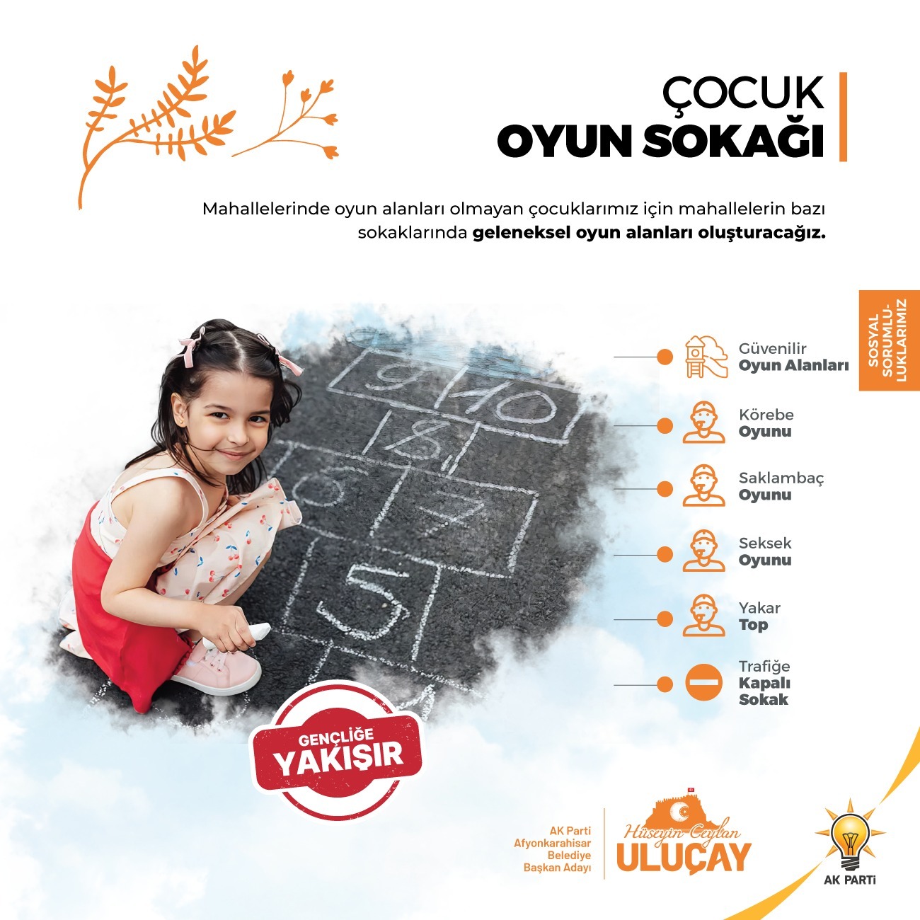 Çocuk Oyun Sokağı Projesi ile ilgili olarak açıklama yapan AK Parti Afyonkarahisar Belediye Başkan Adayı Hüseyin Ceylan Uluçay açıklamasında, “Çocuklarımızın sağlıklı büyüyebilmeleri, güvenli ve kaliteli oyun oynayabilmeleri için şehrimizin bazı sokaklarında geleneksel oyun alanları oluşturacağız. Bu alanlarla çocuklarımızın hayal gücünü geliştirecek, fiziksel aktivitelerini destekleyecek oyunlar yer alacak. Trafiğe kapalı sokaklarda oluşturulacak oyun alanları içerisinde körebe, saklambaç, seksek, yakar top gibi oyunlar yer alacak. Projemizle çocuklarımızın mutluluğunu ve sağlığını ön planda tutacak bir anlayışla hayata geçirilecek. Afyonkarahisar’da çocuklarımız neşe dolu vakit geçirecekleri bir alanlarda gönüllerince oynayabilecekler. Projemizin hayata geçirilirken dikkat edeceğimiz en önemli hususu olan güvenilir alanlardan oluşması. Bu noktada ebeveynlerimizde çocuklarını bu alanlara rahatlıkla götürme fırsatı elde edecek. Aynı zamanda çocuklarımızın arkadaşlık duygularını da pekiştirecek olan projemiz hayırlı uğurlu olsun. 7’den 77’ye tüm hemşehrilerimize hizmet etmeye devam edeceğiz” dedi.