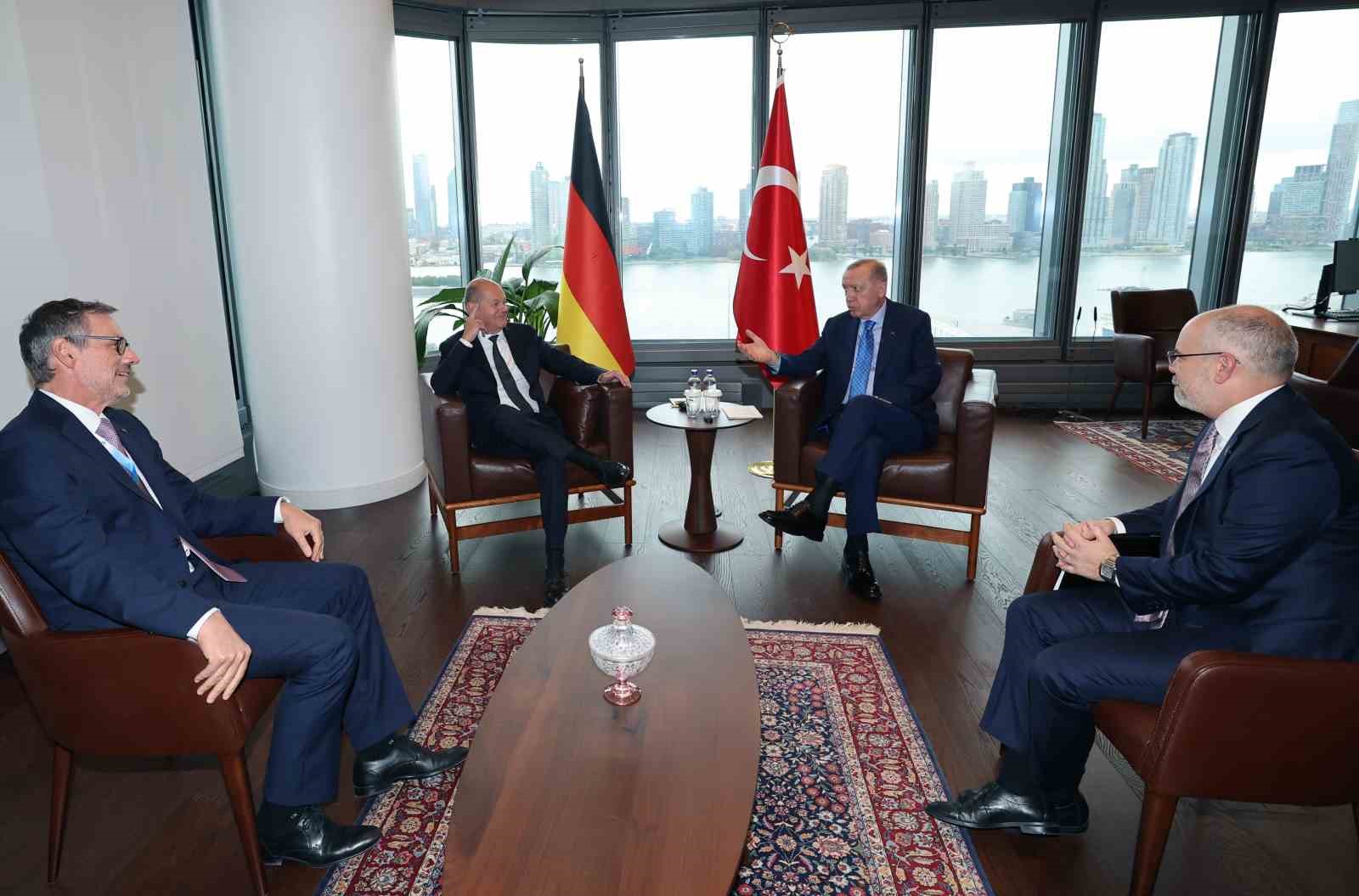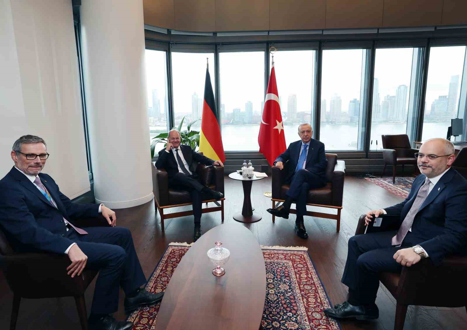 Cumhurbaşkanı Erdoğan görüşmede, Türkiye ve Almanya’nın köklü ilişkileri ve bağları bulunan iki müttefik olduğunu, iş birliğini her alanda geliştirmek, fırsatları değerlendirmek ve çeşitlendirmeye yönelik çalışmaların devam ettiğini, iki ülkeye de kazandıracak adımlar için Türkiye’nin hazır olduğunu ifade etti.