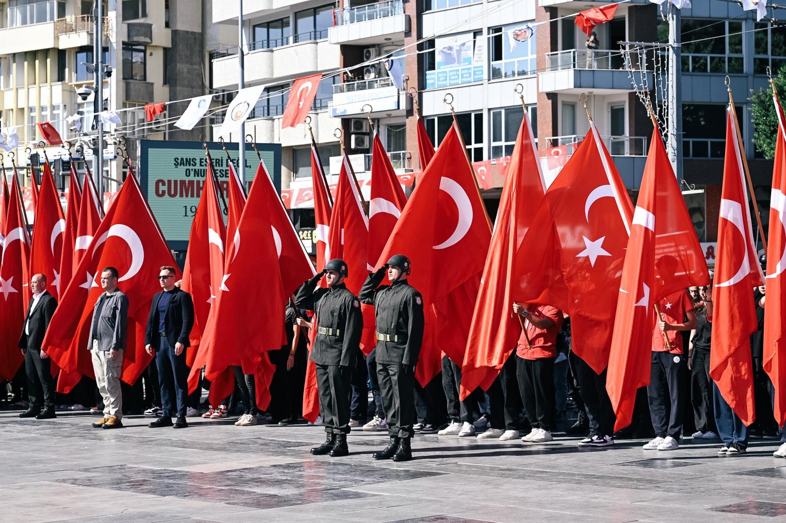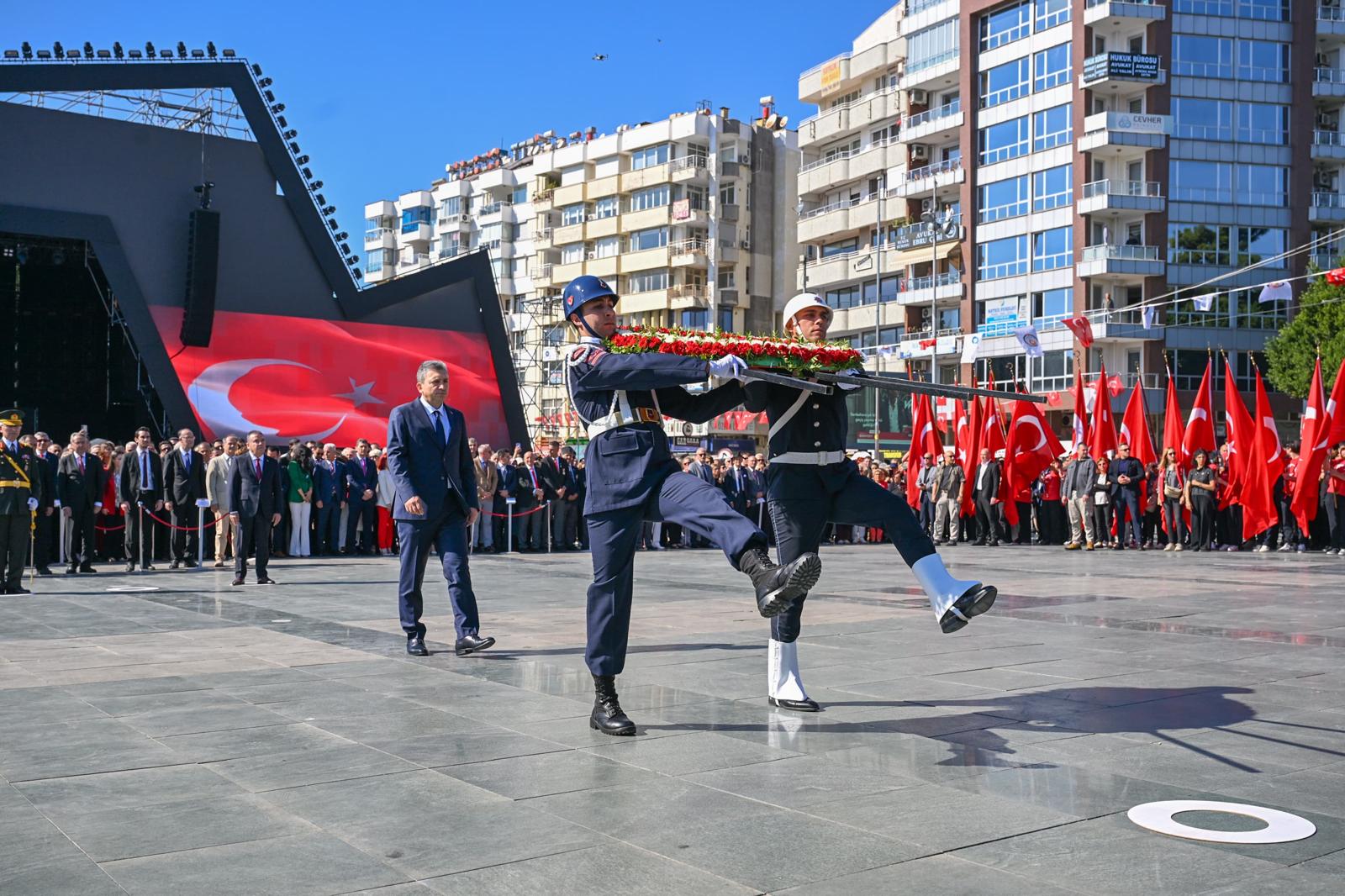 Törende, Vali Hulusi Şahin, Antalya Büyükşehir Belediye Başkanı Muhittin Böcek ve Antalya Garnizon Komutanı Tuğgeneral Hasan Basri Erkuzu tarafından Atatürk Anıtı’na çelenk sunuldu. Tören, Türkiye Cumhuriyeti’nin kurucusu Gazi Mustafa Kemal Atatürk ve silah arkadaşları anısına saygı duruşunda bulunulması ve İstiklal Marşı’nın okunmasıyla sona erdi.