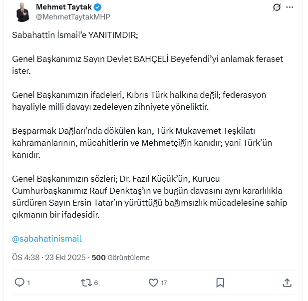 “Genel Başkanımızın ifadeleri, Kıbrıs Türk halkına değil; federasyon hayaliyle milli davayı zedeleyen zihniyete yöneliktir.” Taytak, Kıbrıs Türkü’nün kardeşimiz olduğunu belirterek şu ifadeleri kullandı: “Beşparmak Dağları’nda dökülen kan, Türk Mukavemet Teşkilatı kahramanlarının, mücahitlerin ve Mehmetçiğin kanıdır; yani Türk’ün kanıdır.”