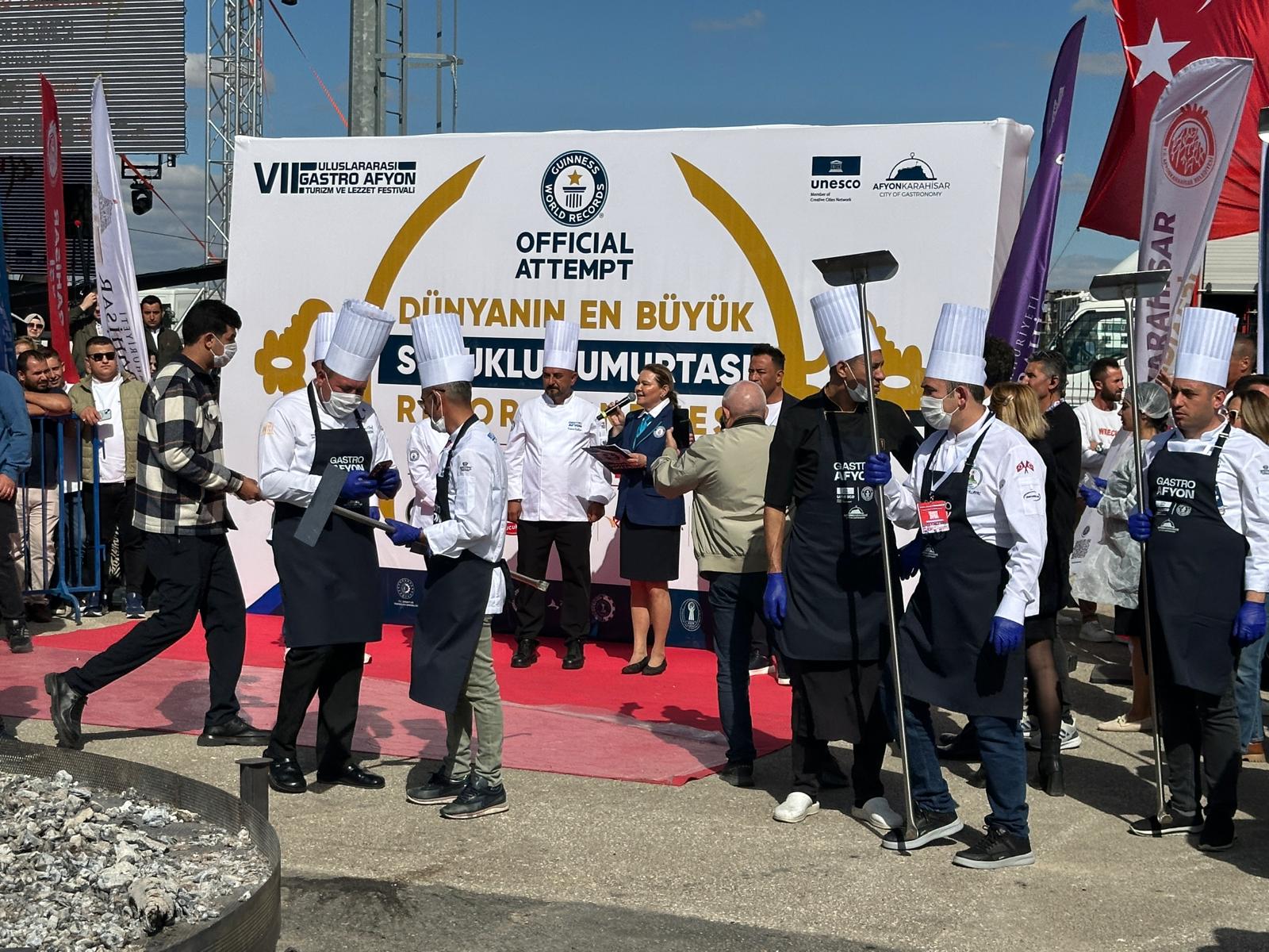 Afyonkarahisar’ın meşhur sucuğu ve yumurtasıyla hazırlanan “dünyanın en büyük sucuklu yumurtası” etkinliği, binlerce kişinin katılımıyla gerçekleştirildi. 25 metrekarelik dev tavada 1 ton sucuk ve 15 bin yumurta kullanılarak hazırlanan dev lezzet, Guinness yetkililerinin tesciliyle dünya rekoru olarak kayda geçti.