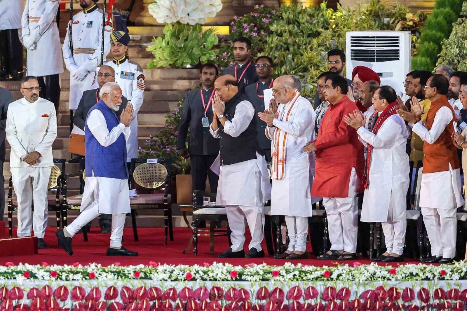 Hindistan’da 9 Nisan’da başlayan ve 1 Haziran’da sona eren genel seçimlerden zaferle ayrılan Narendra Modi ve kafilesi için başkent Yeni Delhi’de bulunan Cumhurbaşkanlığı Sarayı’nda yemin töreni düzenlendi. Rashtrapati Bhavan Sarayı’nda 42 derece sıcaklıkta düzenlenen törende yemin eden Modi, 3. dönem başbakanlık görevine resmen başladı. Törende, Modi’nin Bharatiya Janata Partisi (BJP) liderliğinde kurulan Ulusal Demokratik İttifakı (NDA) koalisyon hükümetinin 72 bakanı da yemin etti.