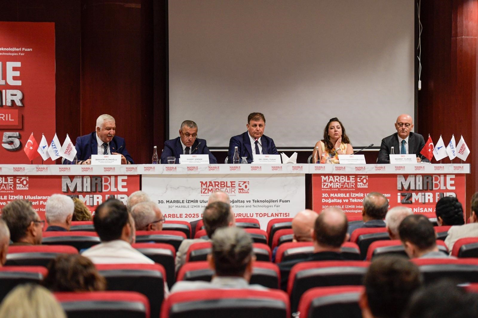 Sektöründe dünyanın en büyük fuarlarının başında gelen MARBLE İZMİR-Uluslararası Doğaltaş ve Teknolojileri Fuarı için çalışmalar devam ediyor. 9-12 Nisan 2025 yılında Fuar İzmir’de yapılacak 30. MARBLE İZMİR Fuarı öncesinde sektör temsilcileri, İzmir Büyükşehir Belediye Başkanı Dr. Cemil Tugay ev sahipliğinde MARBLE İZMİR 2025 Danışma Kurulu Toplantısı’nda buluştu. Toplantıda Tüm Mermer Doğaltaş ve Makinaları Üreticileri Birliği Başkanı Hanifi Şimşek, Ege Maden İhracatçıları Birliği Başkanı İbrahim Alimoğlu, Türkiye Madenciler Derneği Başkanı Mehmet Yılmaz, sivil toplum kuruluşu, oda ile derneklerin başkanları ve temsilcileri, sektör profesyonelleri de yer aldı.