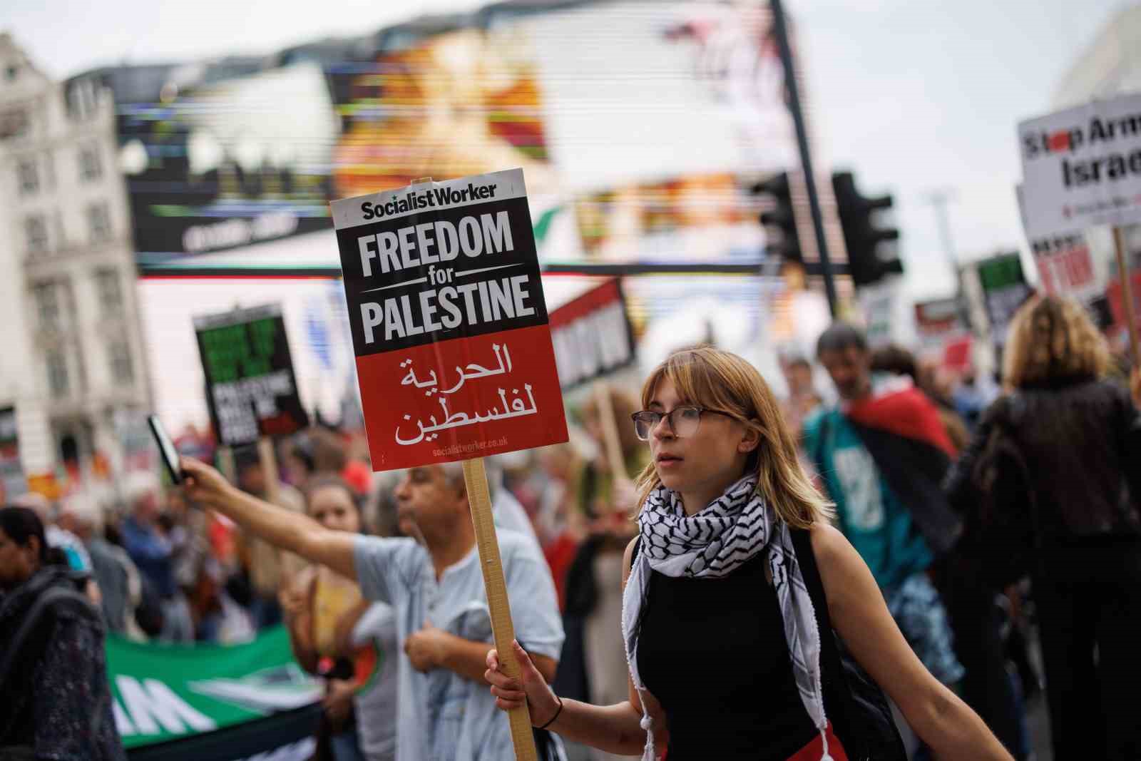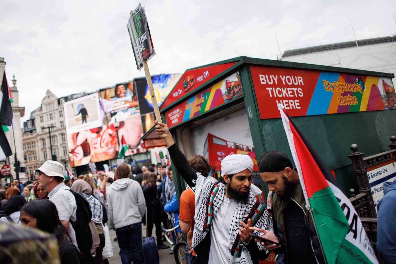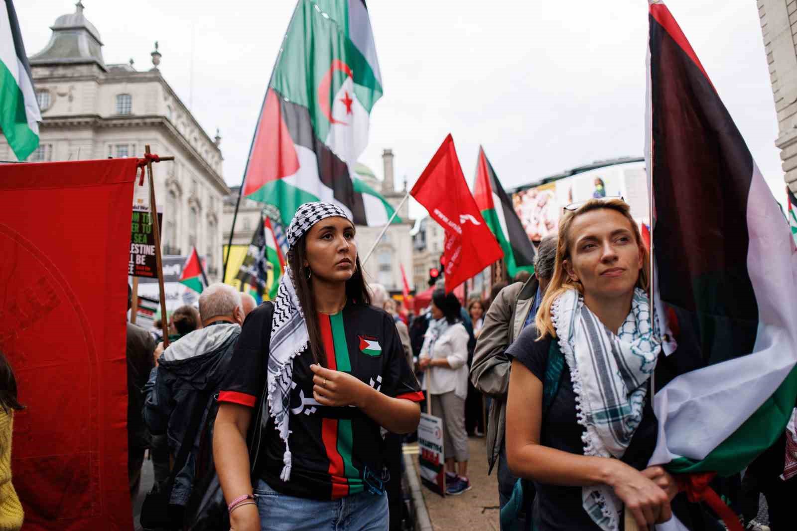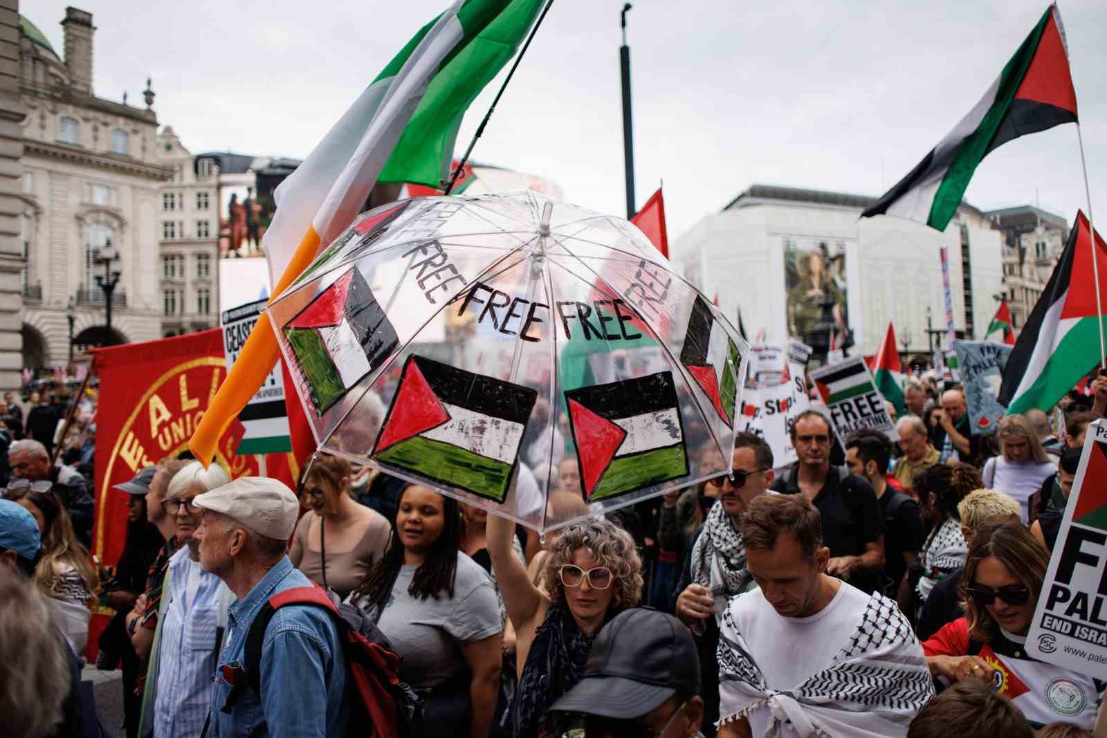 İngiltere’nin başkenti Londra’da düzenlenen ve binlerce kişinin katıldığı Filistin’e destek yürüyüşünde “Nehirden denize Filistin özgür olacak” sloganları atıldı.