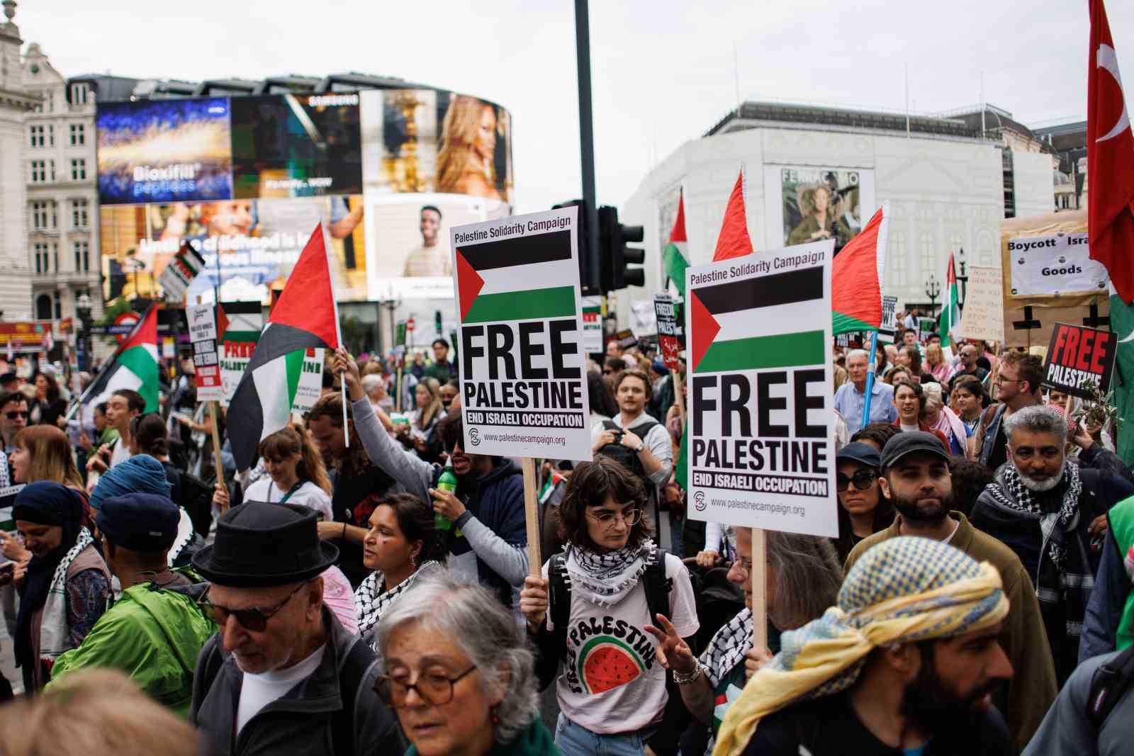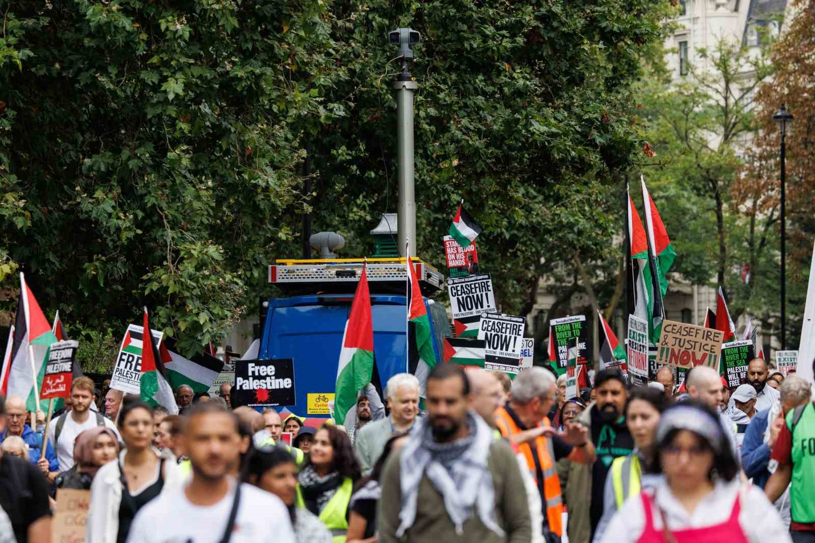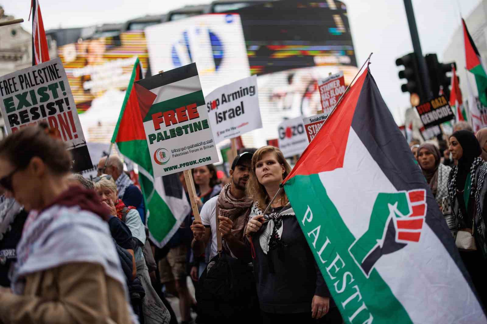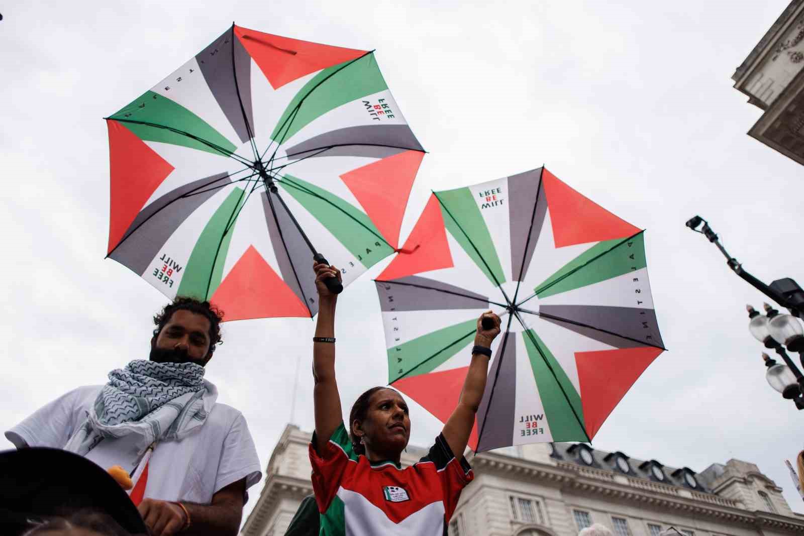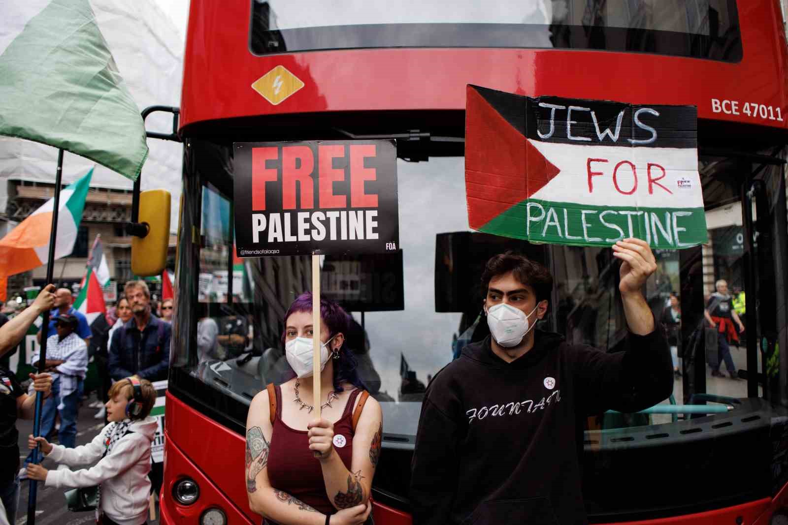 İngiltere’nin başkenti Londra’da düzenlenen ve binlerce kişinin katıldığı Filistin’e destek yürüyüşünde “Nehirden denize Filistin özgür olacak” sloganları atıldı.
