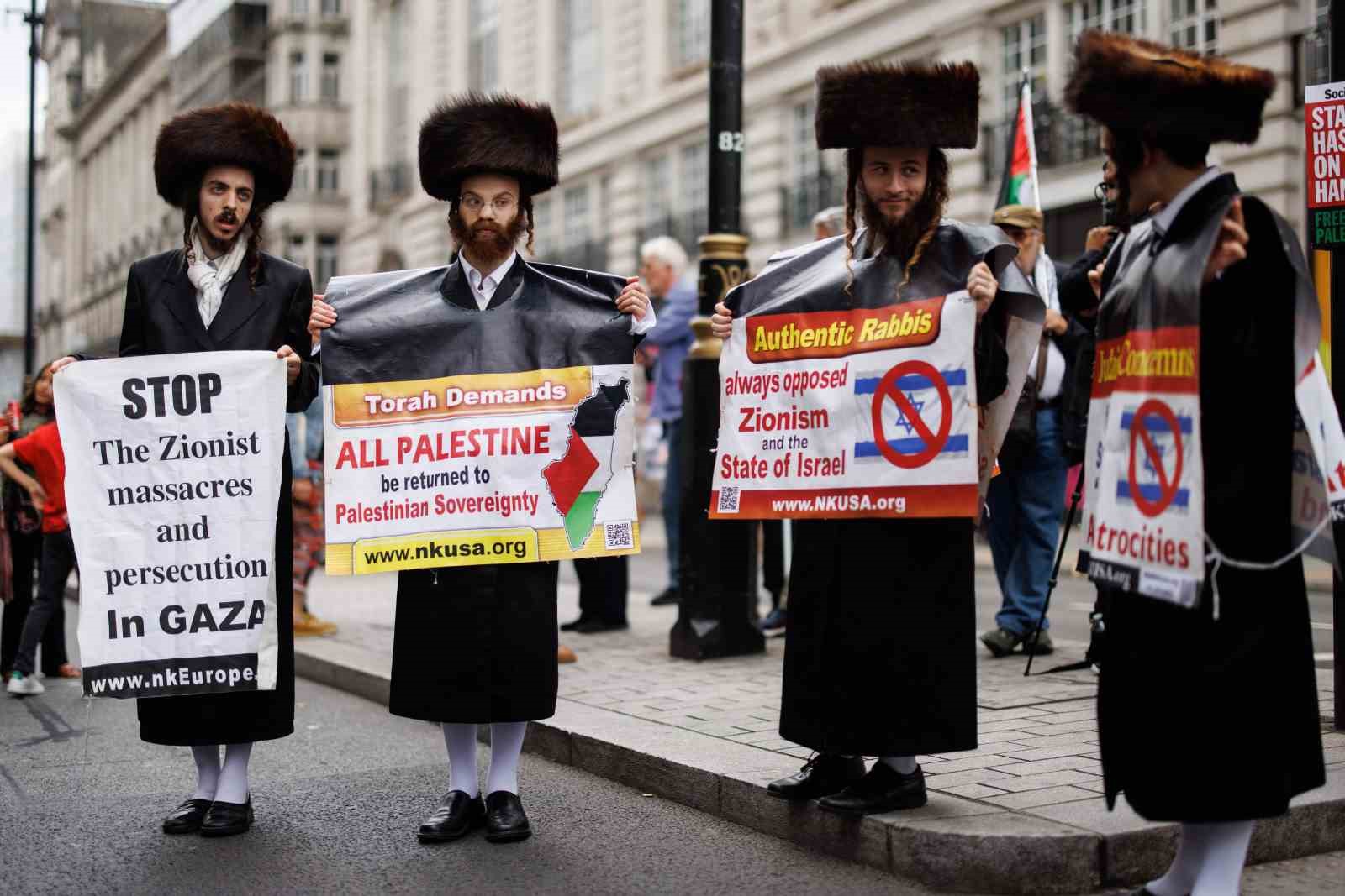 Yürüyüşe destek veren Ortodoks Yahudi cemaati üyeleri ise, “Filistin, egemenliğine geri dönsün”, “Gazze’de siyonist katliamını ve zulmünü durdurun”, “Siyonizme ve İsrail Devleti’ne her zaman karşıyız”, “İsrail Devleti, Yahudi halkı temsil etmiyor” yazılı pankartlar taşıdı.