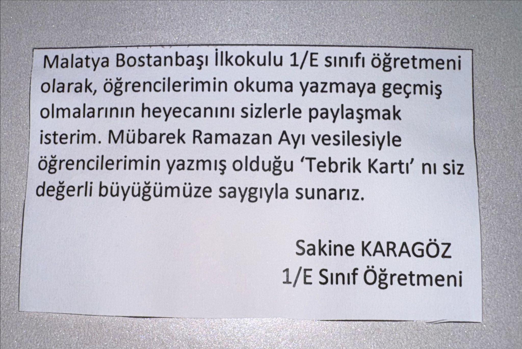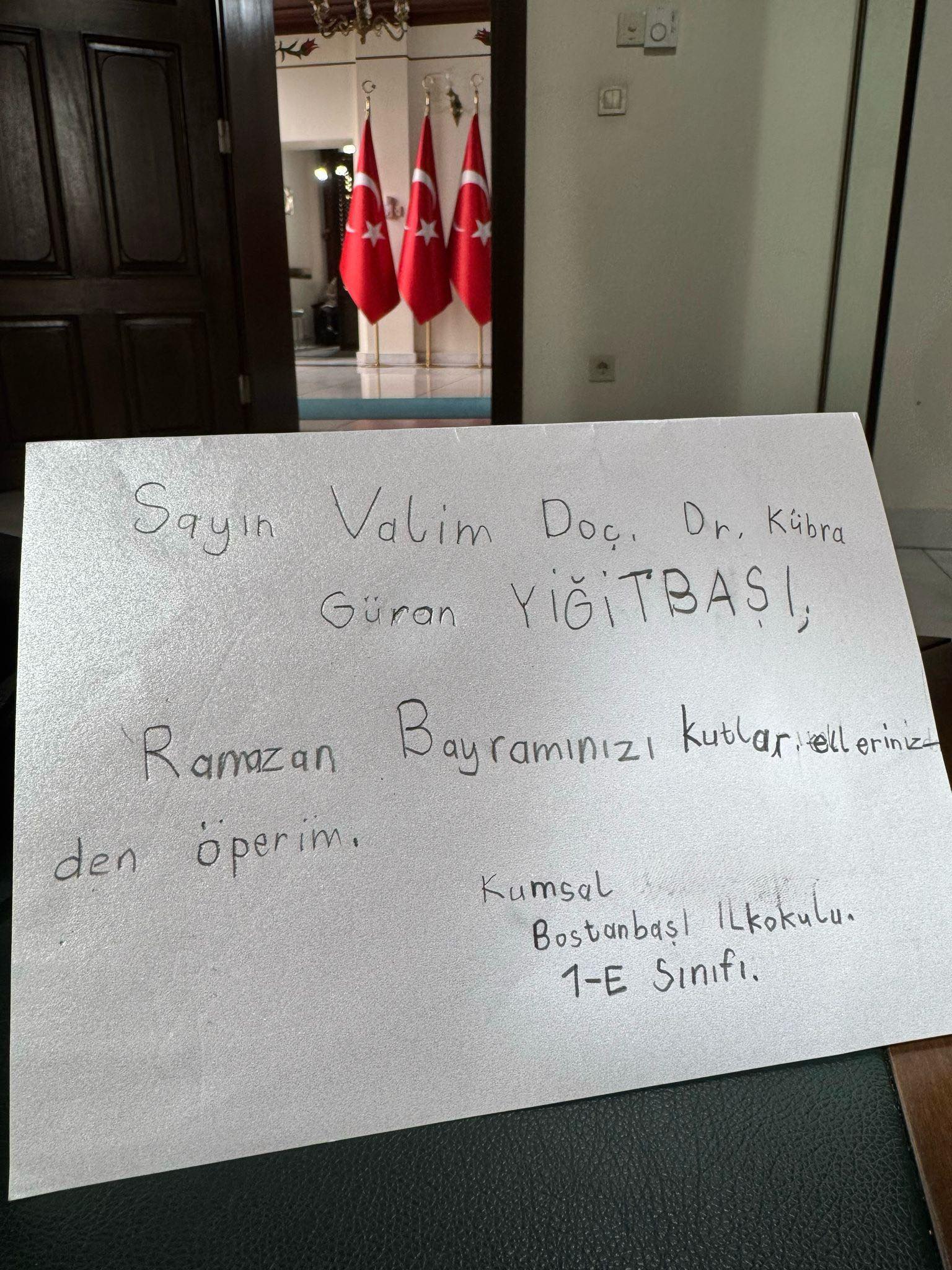 Sosyal medya hesabından paylaşım yapan Afyonkarahisar Valisi Kübra Güran Yiğitbaşı, “Okuma yazmaya geçmiş olmalarının heyecanını ve ilk bayram tebriklerini bizlerle paylaşan Malatya Bostanbaşı İlkokulu 1/E sınıfı öğrencilerimize bu anlamlı mesajları ve bayram tebrikleri için çok teşekkür ediyorum.