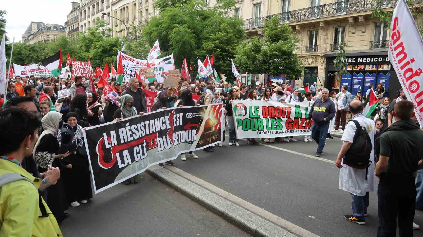 Fransa’nın başkenti Paris’te binlerce Filistin destekçisi sık sık Gazze Şeridi’nde ateşkesin sağlanması çağrısı yaparken, “Masum çocukları öldürmekten vazgeçin” sloganları attı.