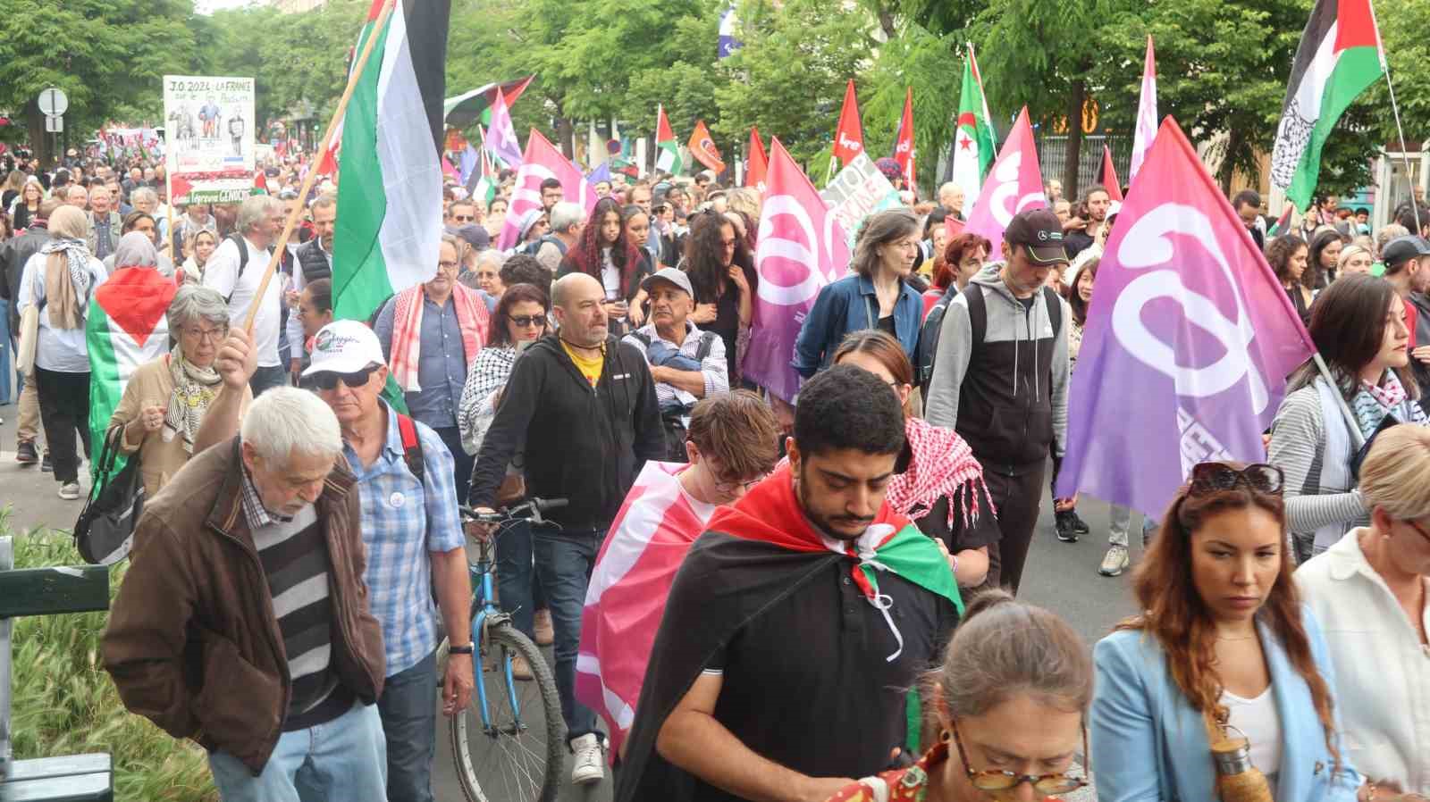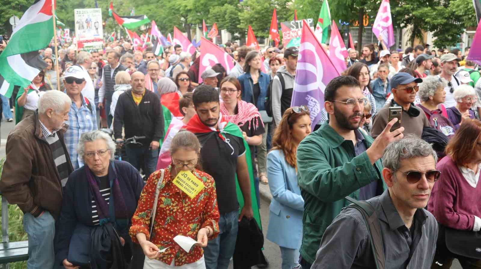 Yürüyüşe katılan bir grup ise, 26 Temmuz-11 Ağustos tarihlerinde düzenlenecek 2024 Paris Olimpiyatlarına İsrailli sporcuların kabul edilmemesi çağrısı yaptı. Ellerinde Filistin ve Fransa bayrakları taşıyan grup, “Soykırımcıların Olimpiyatlarda yeri yok”, “Soykırım insanlık suçudur”, “İnsanların yaşam hakkına silahlarla, bombalarla son verilmesi yasal ve insani bir suçtur” sloganları attı.